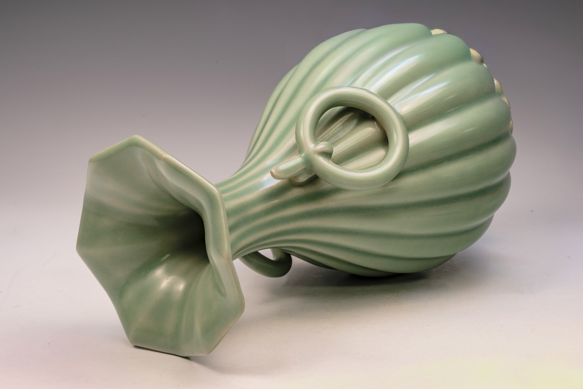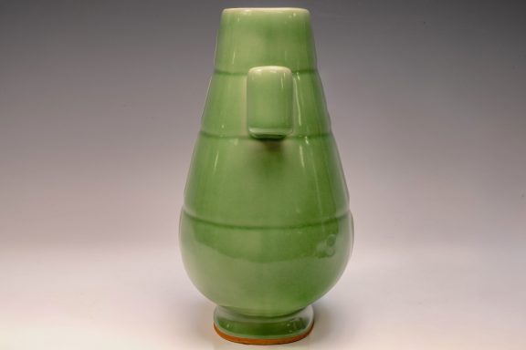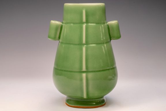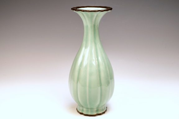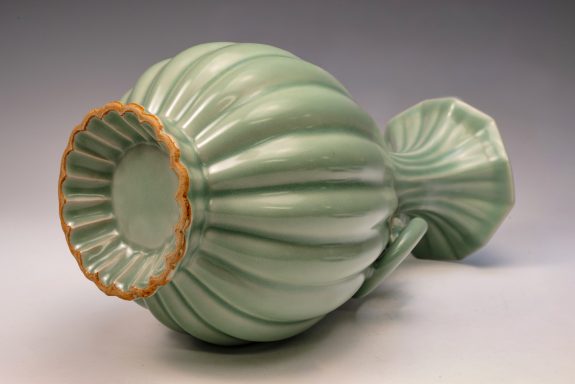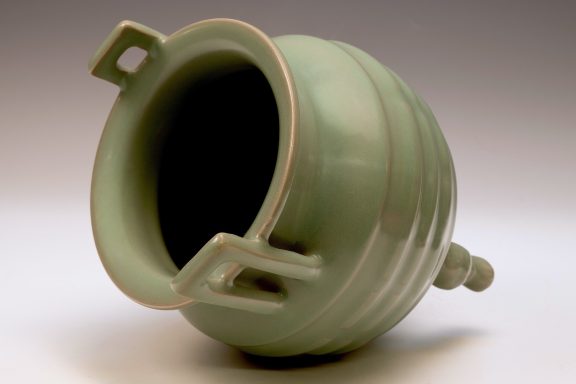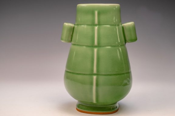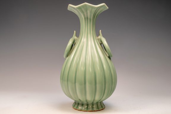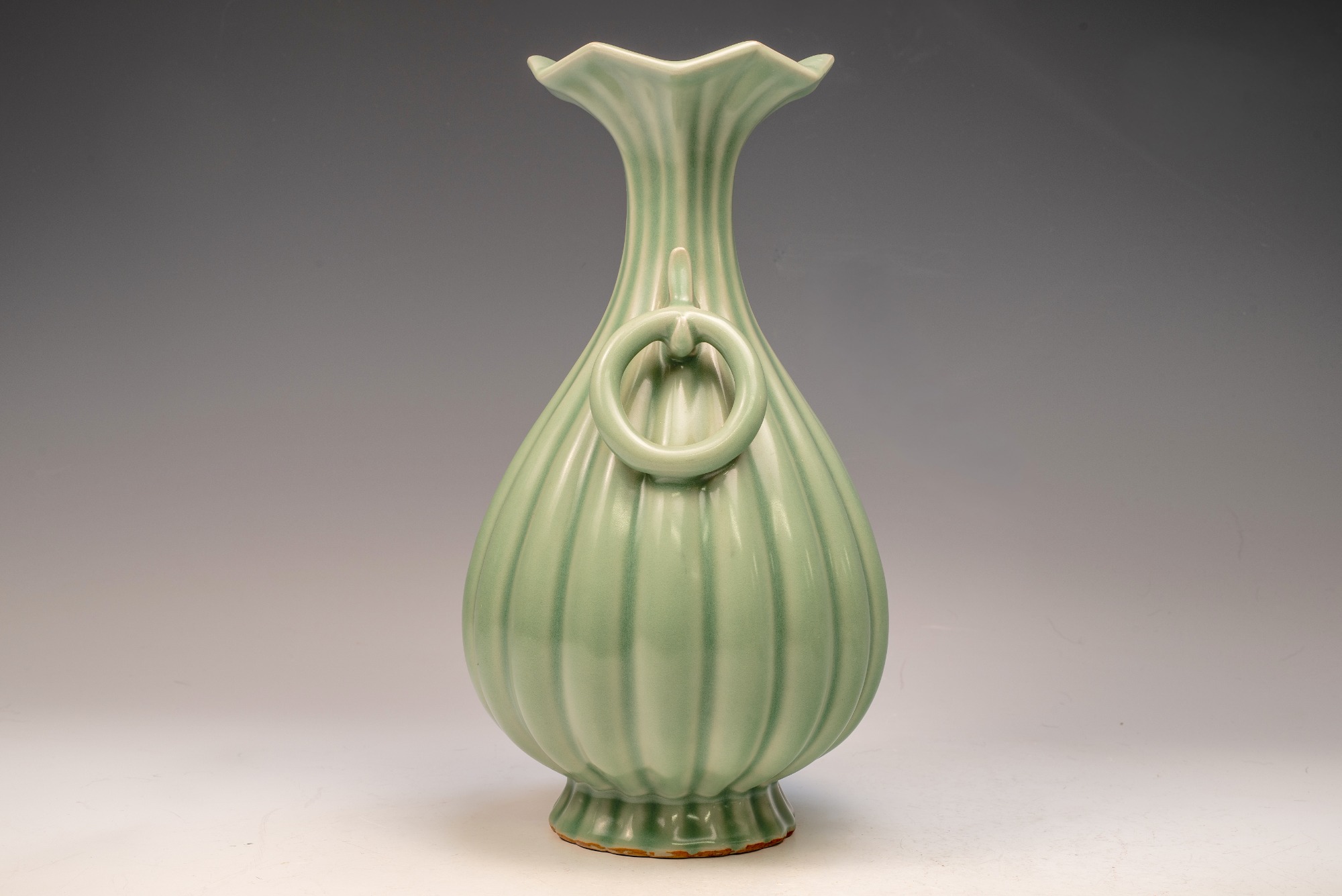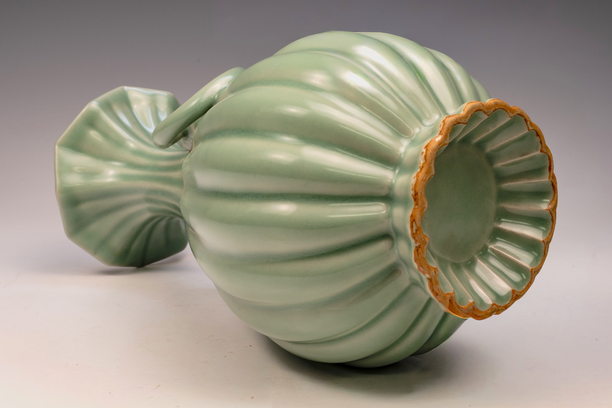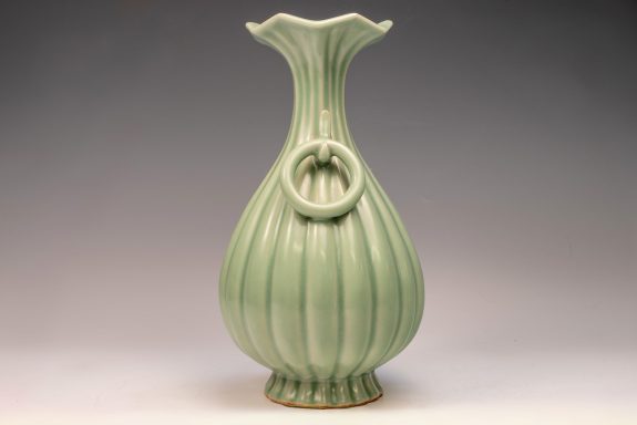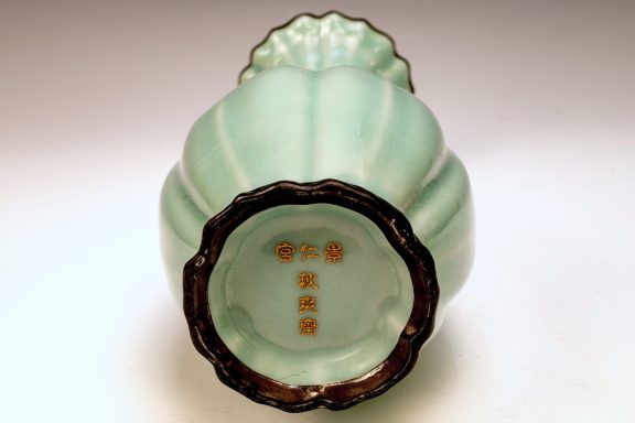 The distinguished Second Commissioned Official Imperial Royal Ru-kiln Ribbed Flower Bud Vase with Ring Handles is esteemed as one of the preeminent examples of celadon ceramics produced in China. Crafted specifically for Emperor Huizong and his court, this vase exemplifies the artistry and opulence characteristic of the period. Its pale celadon glaze is both rich and smooth, incorporating Rare Blue Crushed Agate into the glaze composition. The agate inclusions can be observed through a 20x loupe or microscope, as demonstrated in the accompanying microscopic photographs adjacent to each piece. The utilization of Rare Crushed Blue Agate is a defining feature of all wares from the Official Imperial Royal Ru-kiln under Emperor Huizong’s patronage. Furthermore, the Second Commissioned Royal Ribbed Flower Bud Vase presents an off-white body that has acquired an iron brown tint post-firing. This Vase measures approximately 11 5/8 inches in height and is one of the surviving examples from the Northern Song Dynasty Official Imperial Royal Ru-kiln collection associated with Emperor Huizong. ppjrs