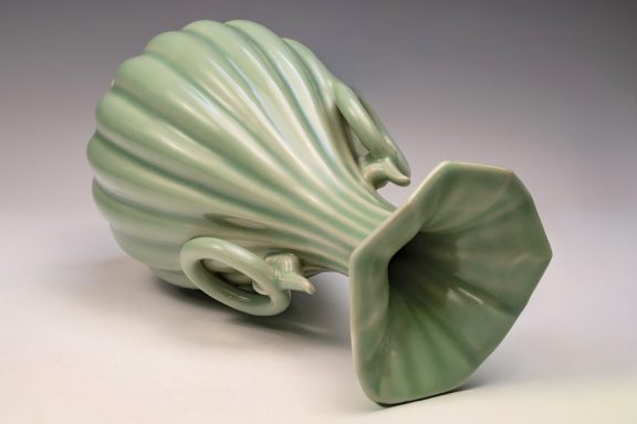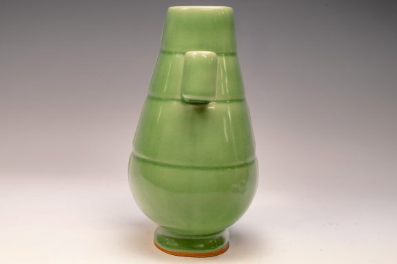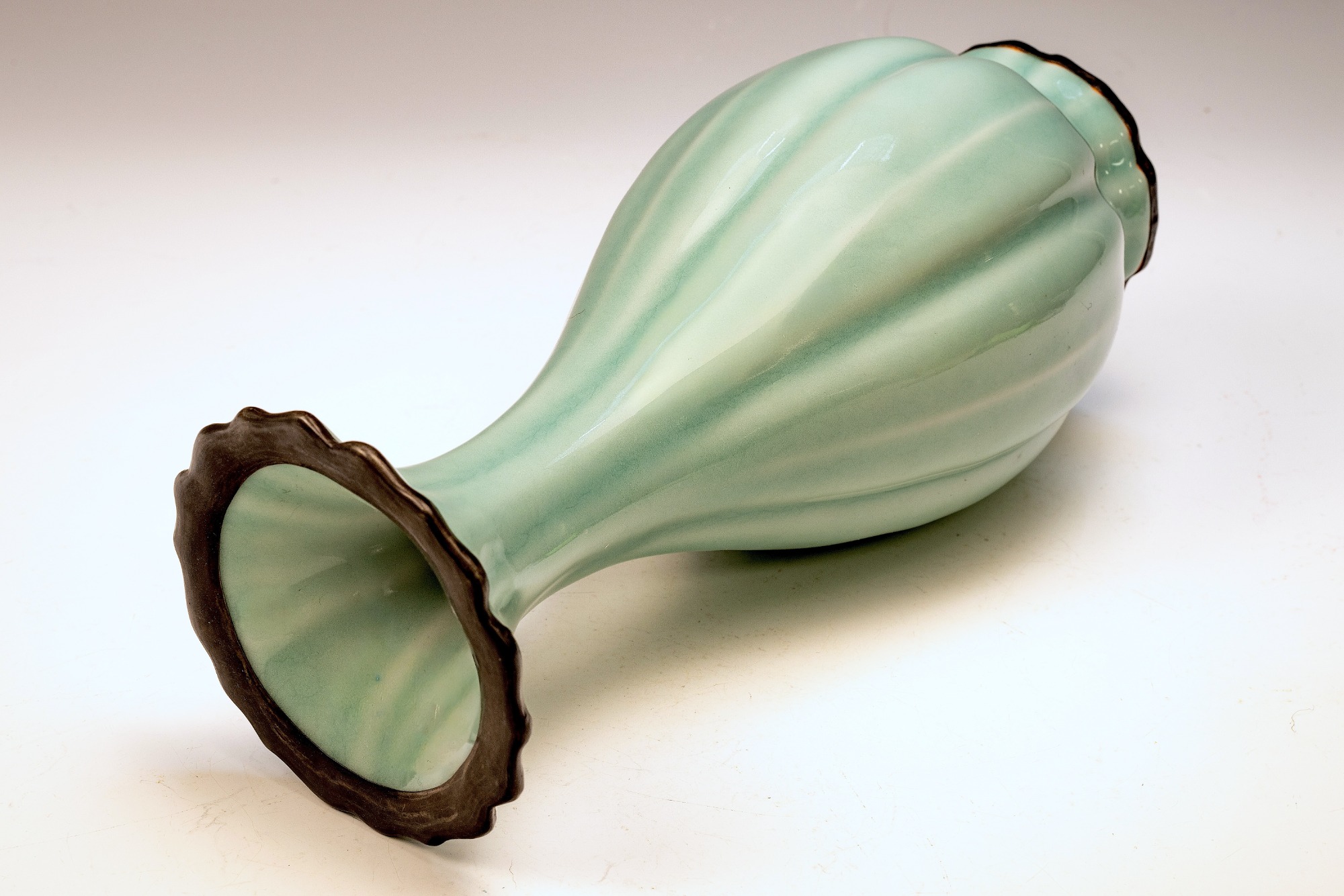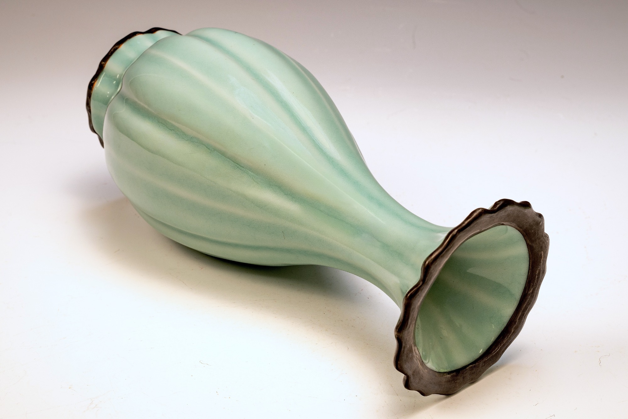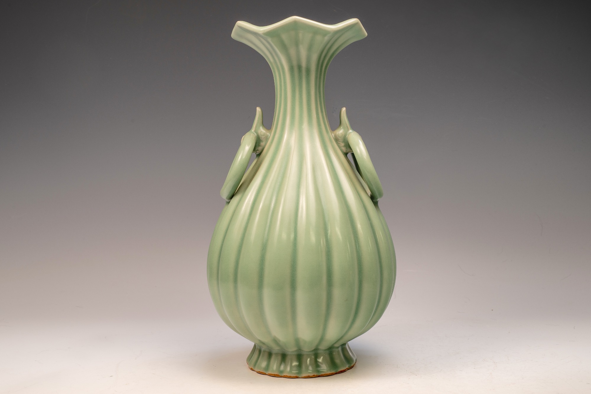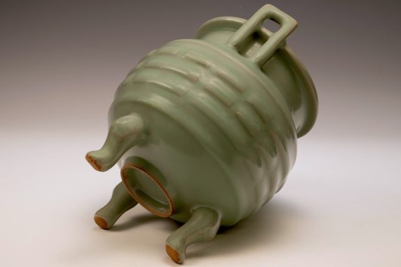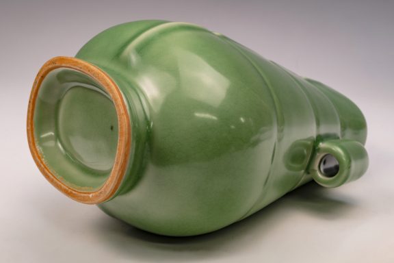The distinguished Second Commissioned Official Imperial Royal Ru-kiln Ribbed Flower Bud Vase with Ring Handles is esteemed as one of the preeminent examples of celadon ceramics produced in China. Crafted specifically for Emperor Huizong and his court, this vase exemplifies the artistry and opulence characteristic of the period. Its pale celadon glaze is both rich and smooth, incorporating Rare Blue Crushed Agate into the glaze composition. The agate inclusions can be observed through a 20x loupe or microscope, as demonstrated in the accompanying microscopic photographs adjacent to each piece. The utilization of Rare Crushed Blue Agate is a defining feature of all wares from the Official Imperial Royal Ru-kiln under Emperor Huizong’s patronage. Furthermore, the Second Commissioned Royal Ribbed Flower Bud Vase presents an off-white body that has acquired an iron brown tint post-firing. This Vase measures approximately 11 5/8 inches in height and is one of the surviving examples from the Northern Song Dynasty Official Imperial Royal Ru-kiln collection associated with Emperor Huizong. ppjrs