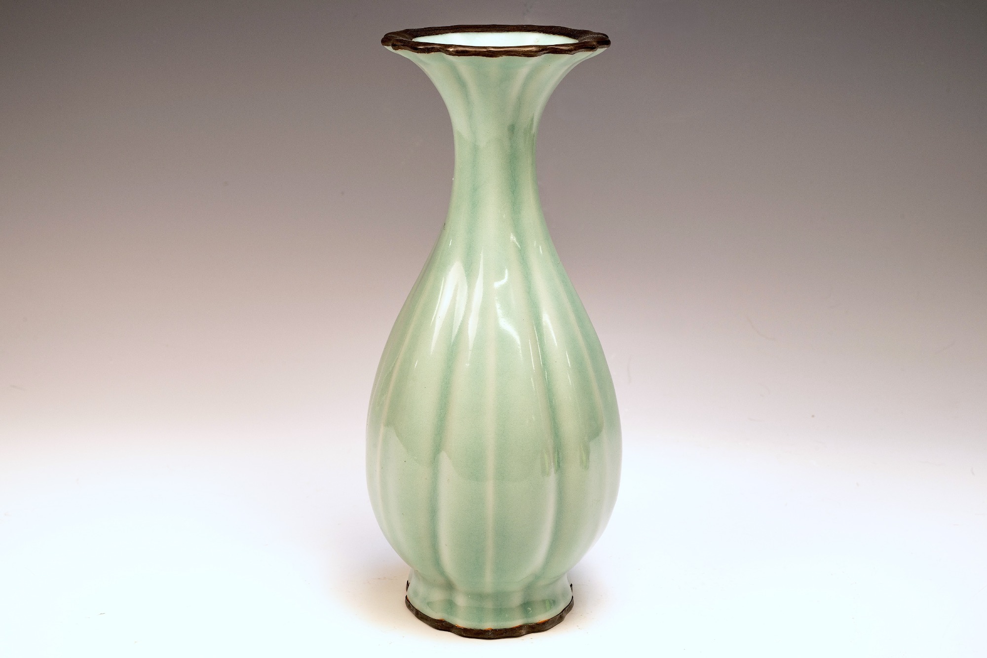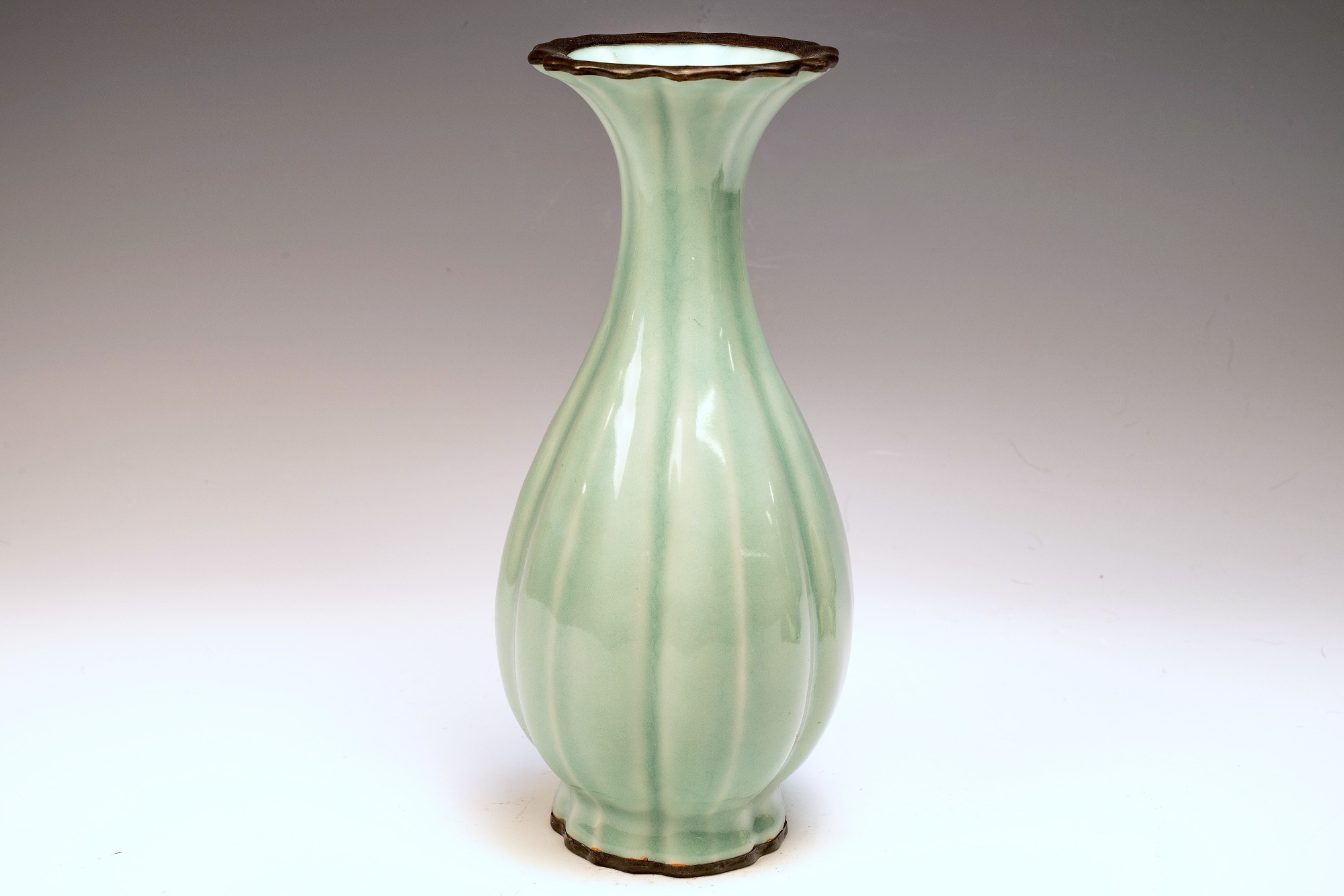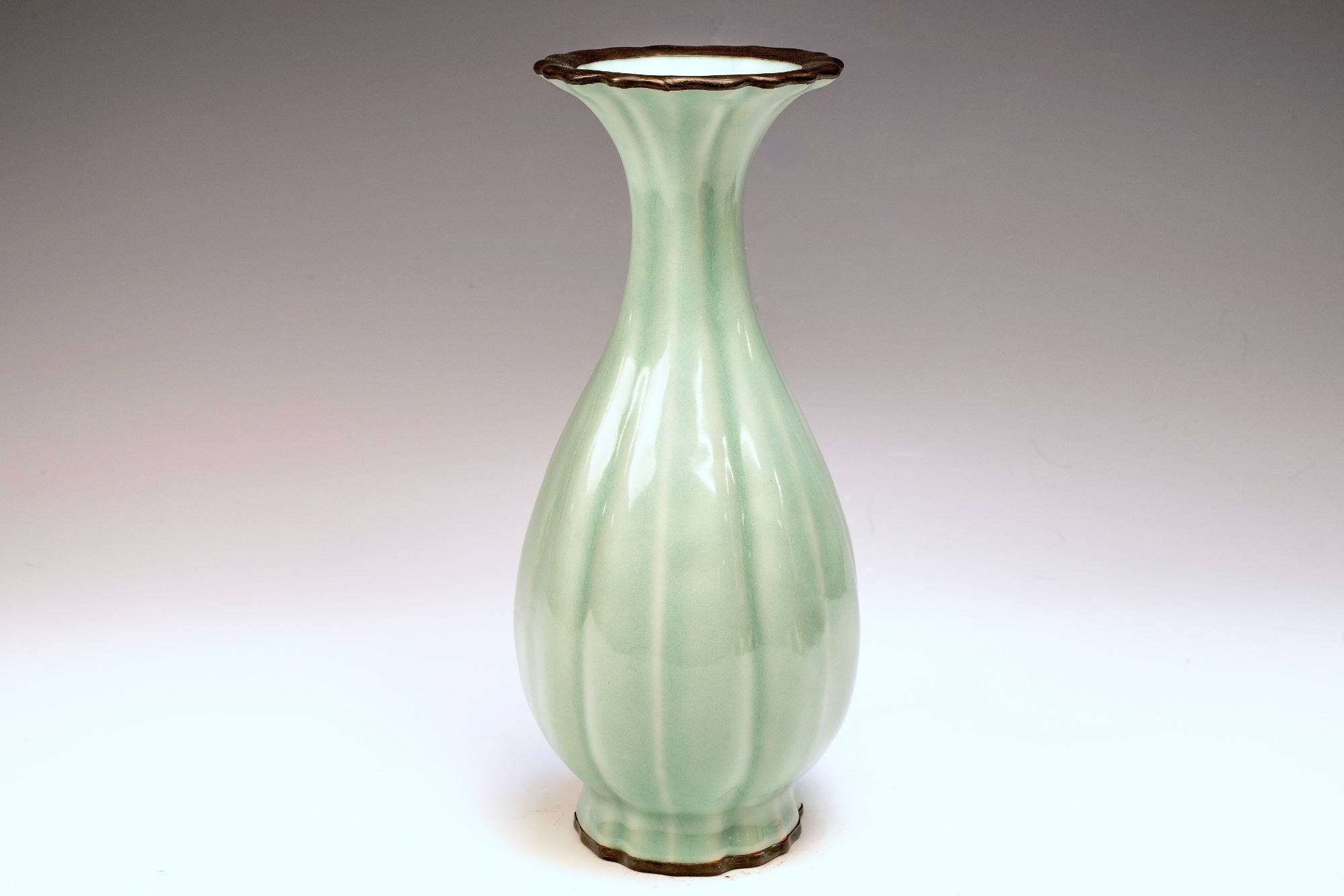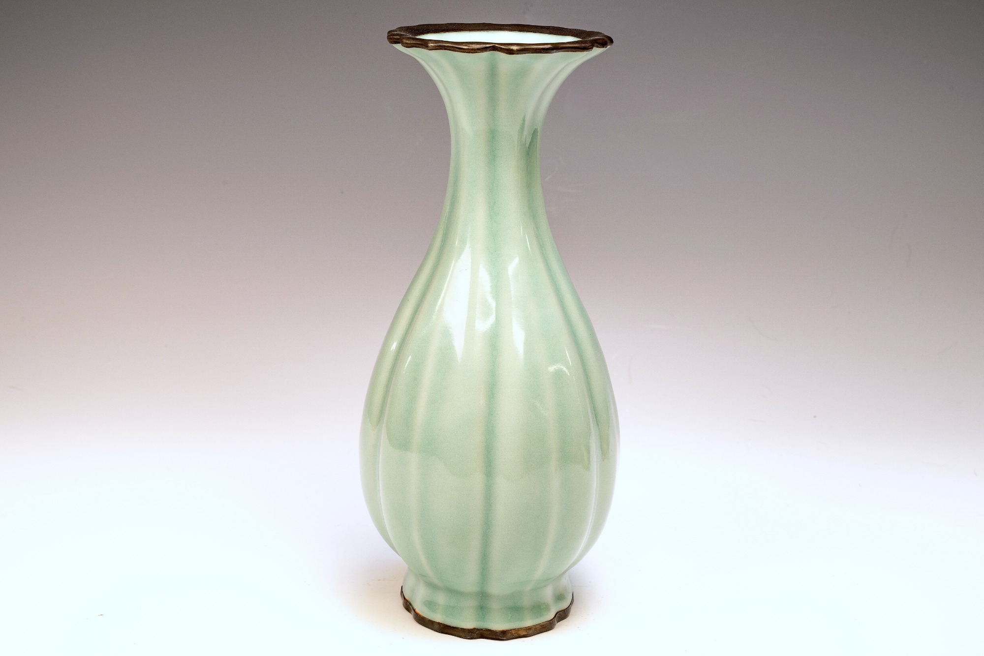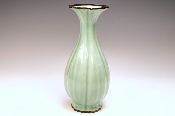 This highly esteemed second commissioned official Royal Imperial Ru-kiln trumpet-form vase represents a pinnacle of elegance within the exquisite celadon wares produced in China. Crafted exclusively for Emperor Huizong and his court, this remarkable piece showcases a striking celadon glaze characterized by exceptional richness and smoothness, devoid of any crackling. The inclusion of crushed agate in the glaze is discernible under magnification, as evidenced by the microscopic images accompanying each piece. The use of crushed Blue Agate is a distinctive feature reserved for the Official Royal Imperial Ru wares developed during Emperor Huizong's reign. Furthermore, the trumpet-form vase is adorned with fire-gilded copper bands around the rim and base, which exhibit signs of corrosion, specifically cuprite and malachite. This corrosion serves as a testament to the vase’s age, providing a more reliable indication of authenticity than thermoluminescence testing. Such identification methods are universally accepted by experts in the field and are impervious to forgery. The vase's off-white body has developed a subtle brown hue due to the firing process. Standing at an impressive height of 8 ¾ inches, this artifact is a notable remnant of Emperor Huizong's surviving collection of Northern Song Imperial Ru ware. ppjrs