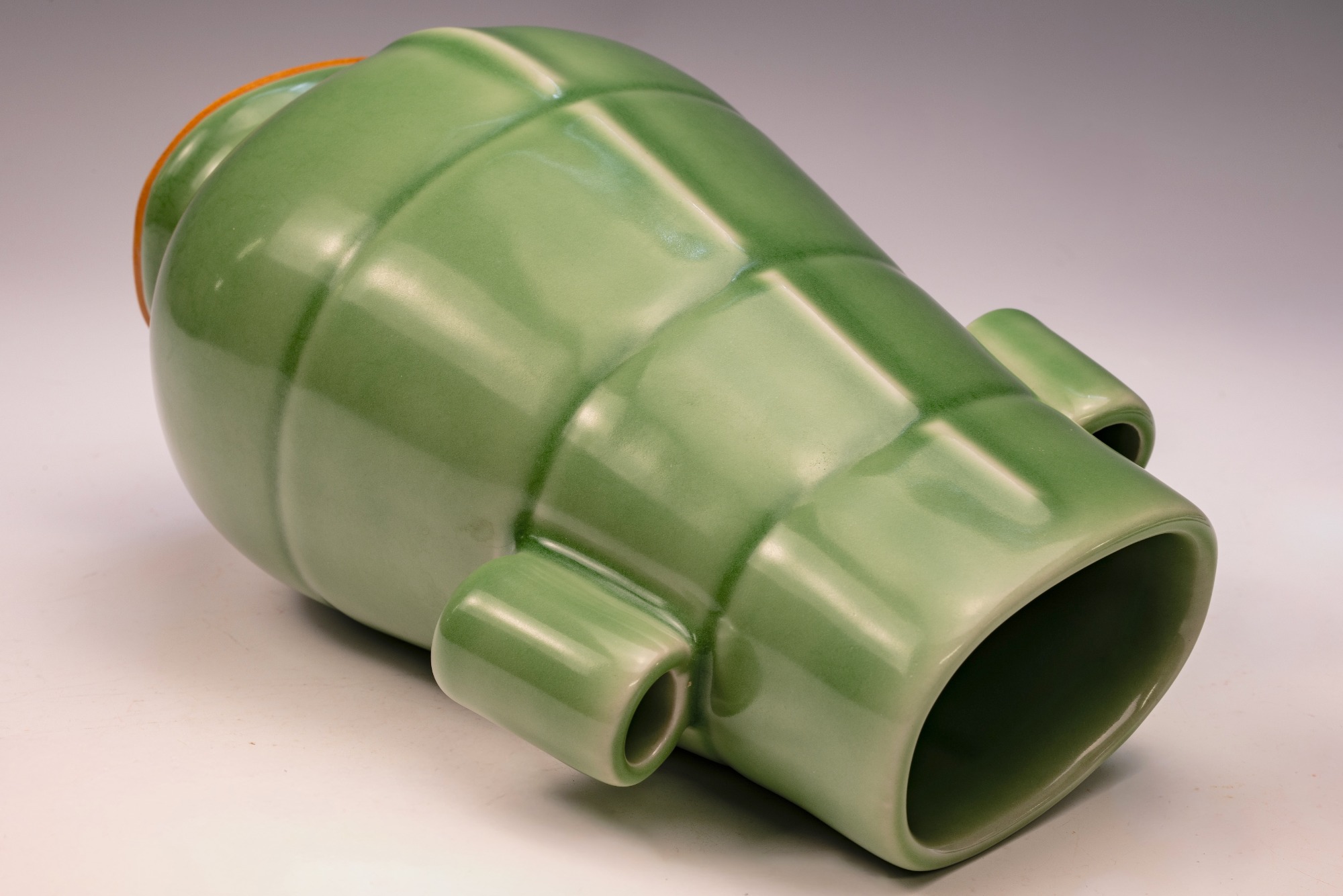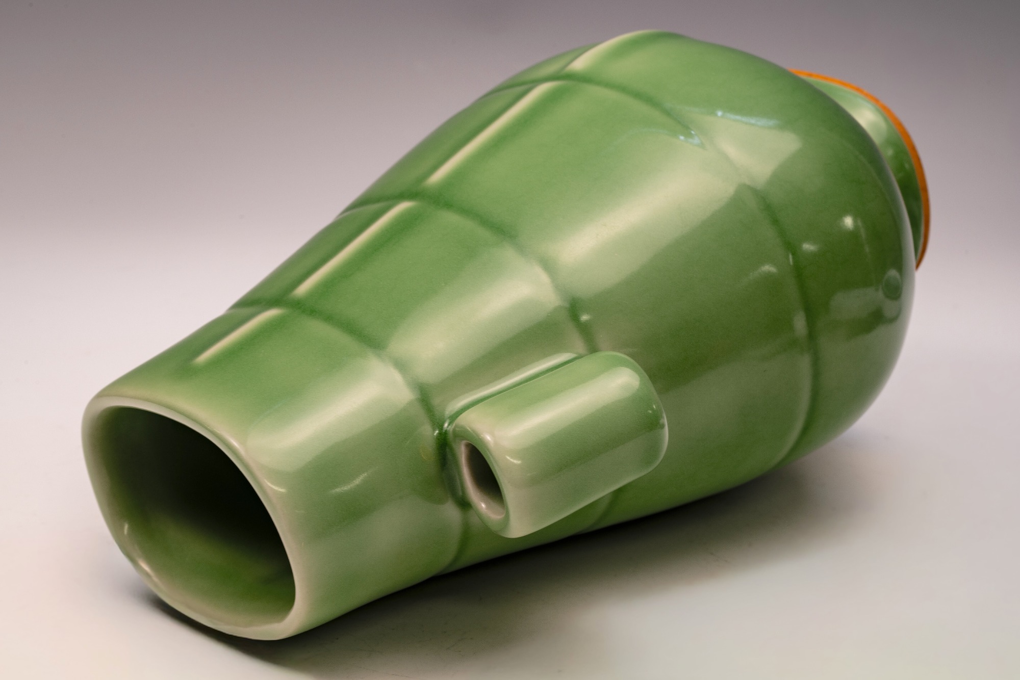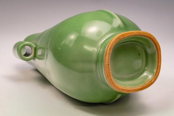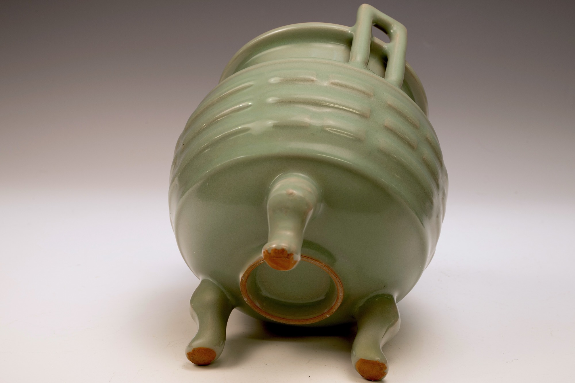 This distinguished Second Commissioned Official Imperial Royal Ru-Kiln Vase, noted for its elegant oval shape and distinctive tube handles, represents one of the finest examples of celadon pottery in the rich tradition of Chinese craftsmanship. Commissioned specifically for Emperor Huizong and his court, this rich celadon vase is remarkable for its opulent glaze, which is not only aesthetically pleasing but also exceptionally smooth to the touch. Notably, the glaze incorporates rare crushed blue agate, a unique characteristic that can be examined in detail using a 20x loupe or microscope, providing insight into the distinctive fragments of agate, as illustrated in the accompanying microscopic imagery along with photographs of the vase. The presence of crushed blue agate is a signature element of all Official Imperial Royal Ru-Kiln wares commissioned during Emperor Huizong's reign. The second commissioned royal vase features an off-white body that developed an iron-brownish hue after firing. This exceptional artifact stands approximately 8 1/2 inches in height and is part of the esteemed collection of surviving Northern Song Imperial Royal Ru-Kiln wares attributed to Emperor Huizong. ppjrs