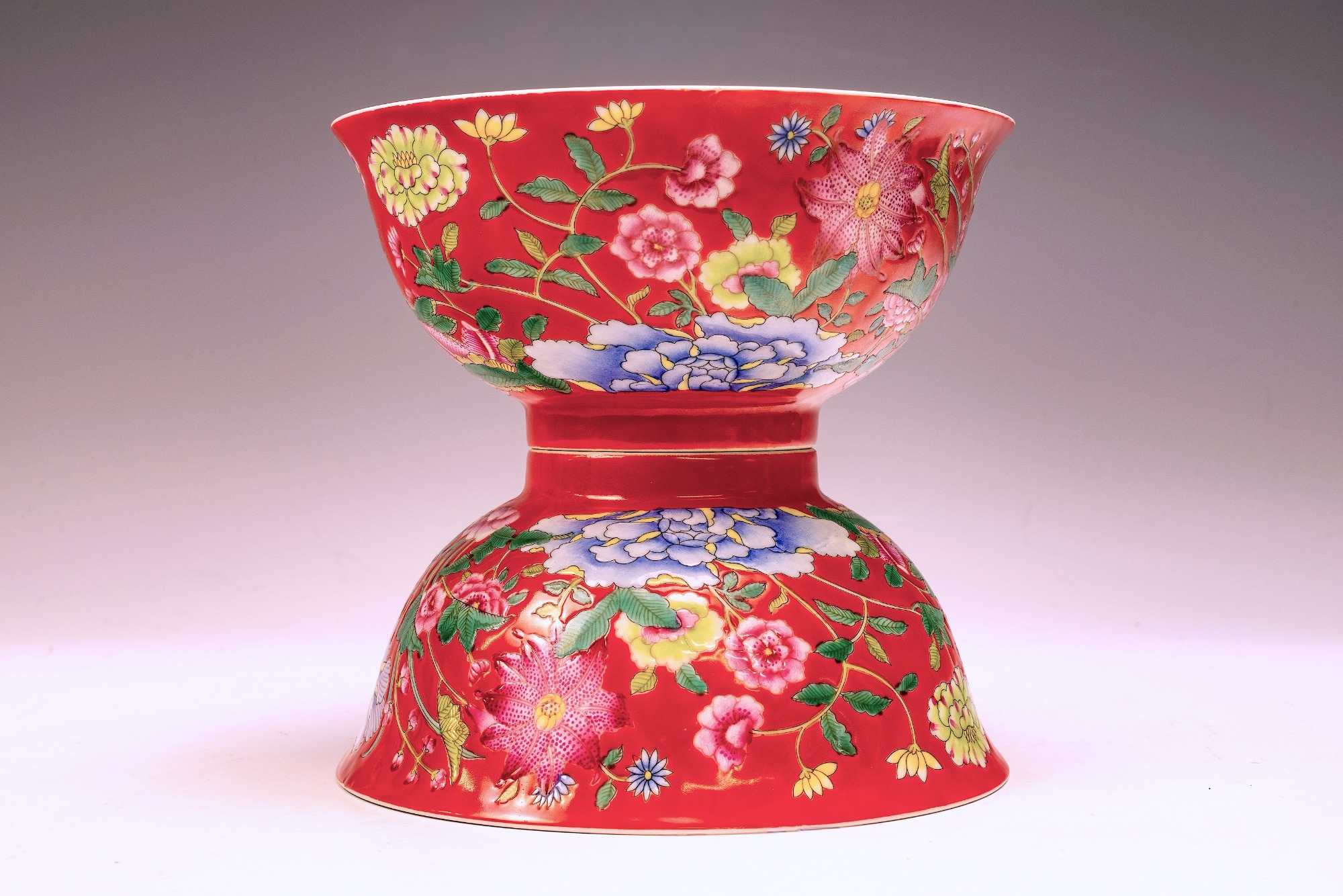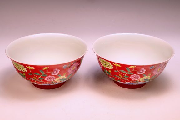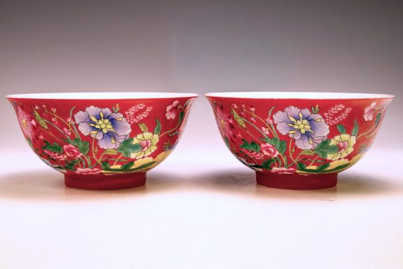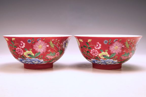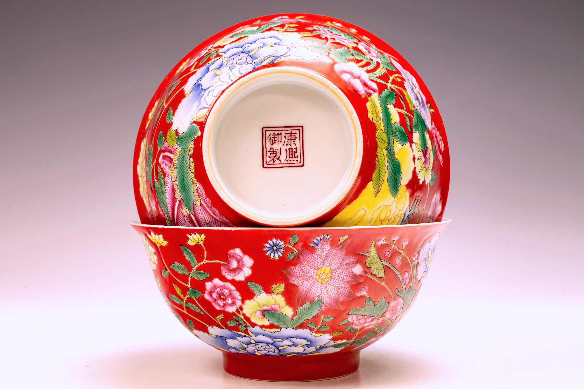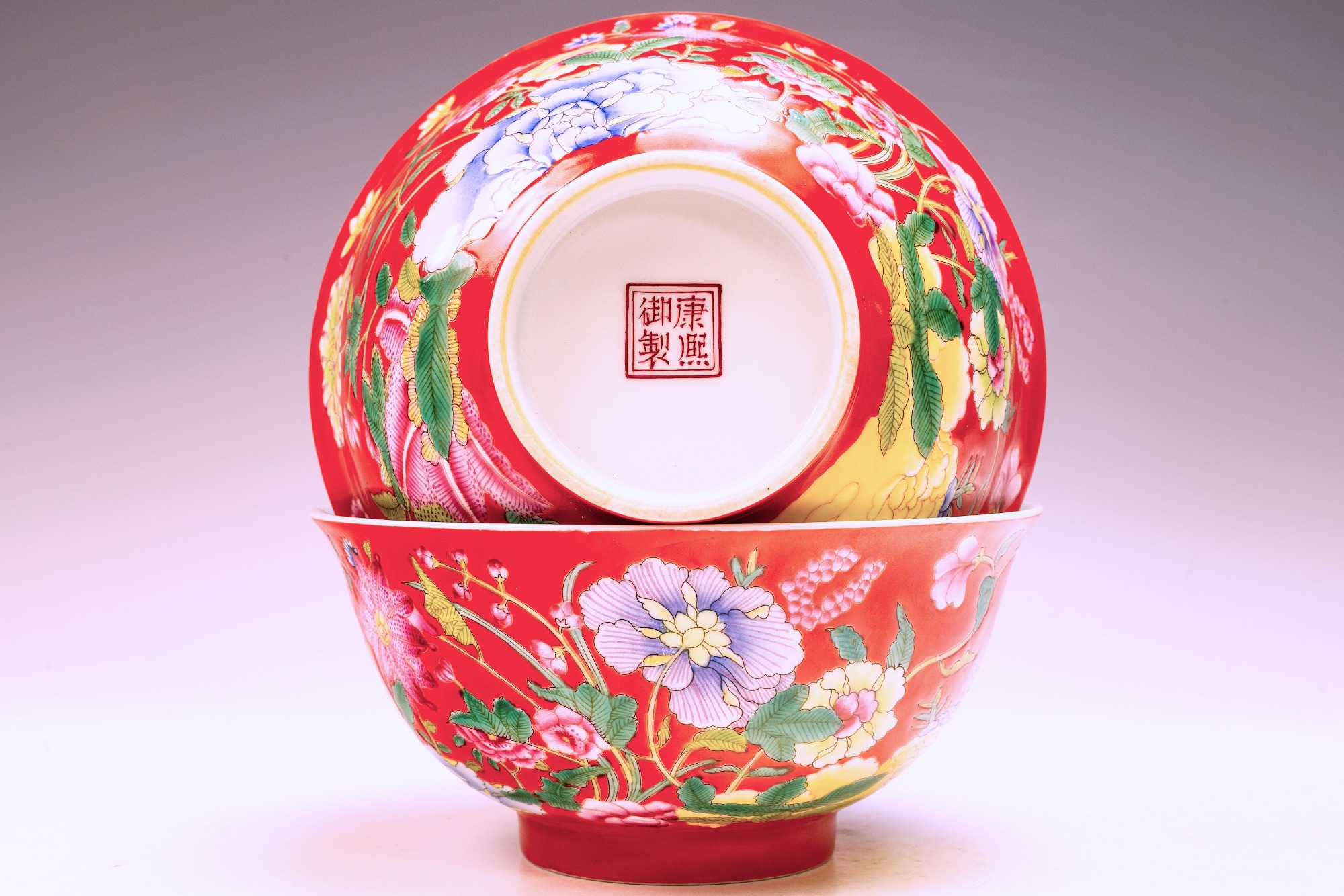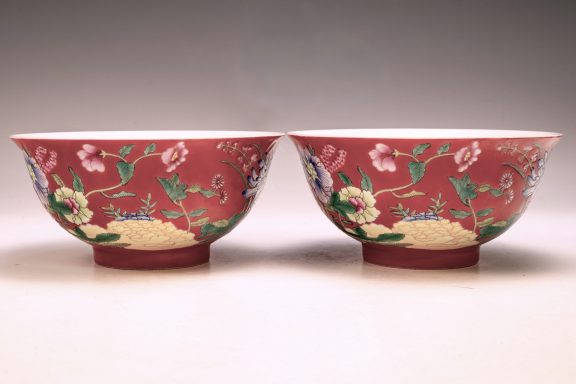 This exceptional pair of bowls from the Qing Dynasty, specifically marked as Kangxi, Falangcai, represents an elegant design and is embellished with a remarkable array of colored enamels. Each bowl features intricately detailed depictions of flowers, buds, and peonies, showcasing the characteristic artistry of this historic period. Importantly, the absence of crazing in the enamels—a condition frequently observed in falangcai ceramics—significantly enhances their overall desirability. Furthermore, the exquisite detailing and rich colors are complemented by signs of flaking in the biscuit, alongside an iron firing ring present on the footring, which are indicative of their age. The bases of the bowls are marked with the Deep Red Kangxi four-character Yuzhi mark, enclosed within double squares. With approximate dimensions of 6 1/8 inches in diameter, these Kangxi bowls stand as a remarkable testament to the craftsmanship of their era. ppjrs