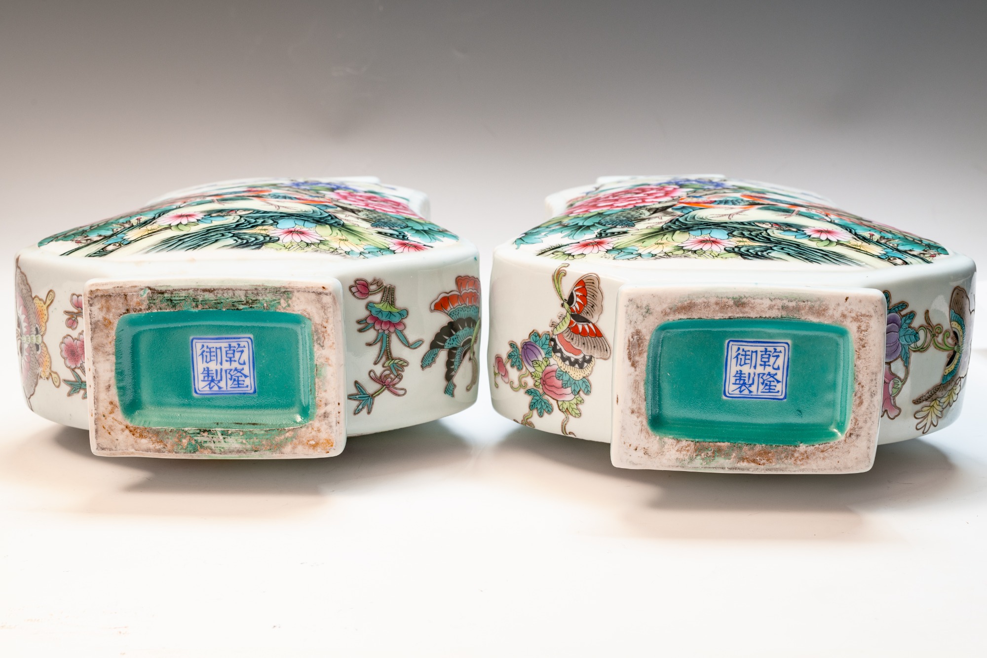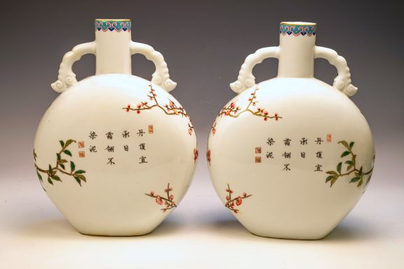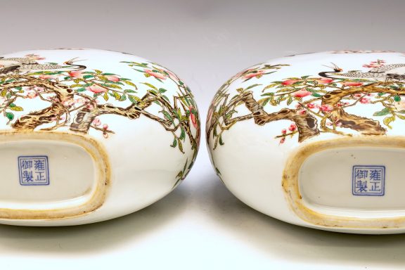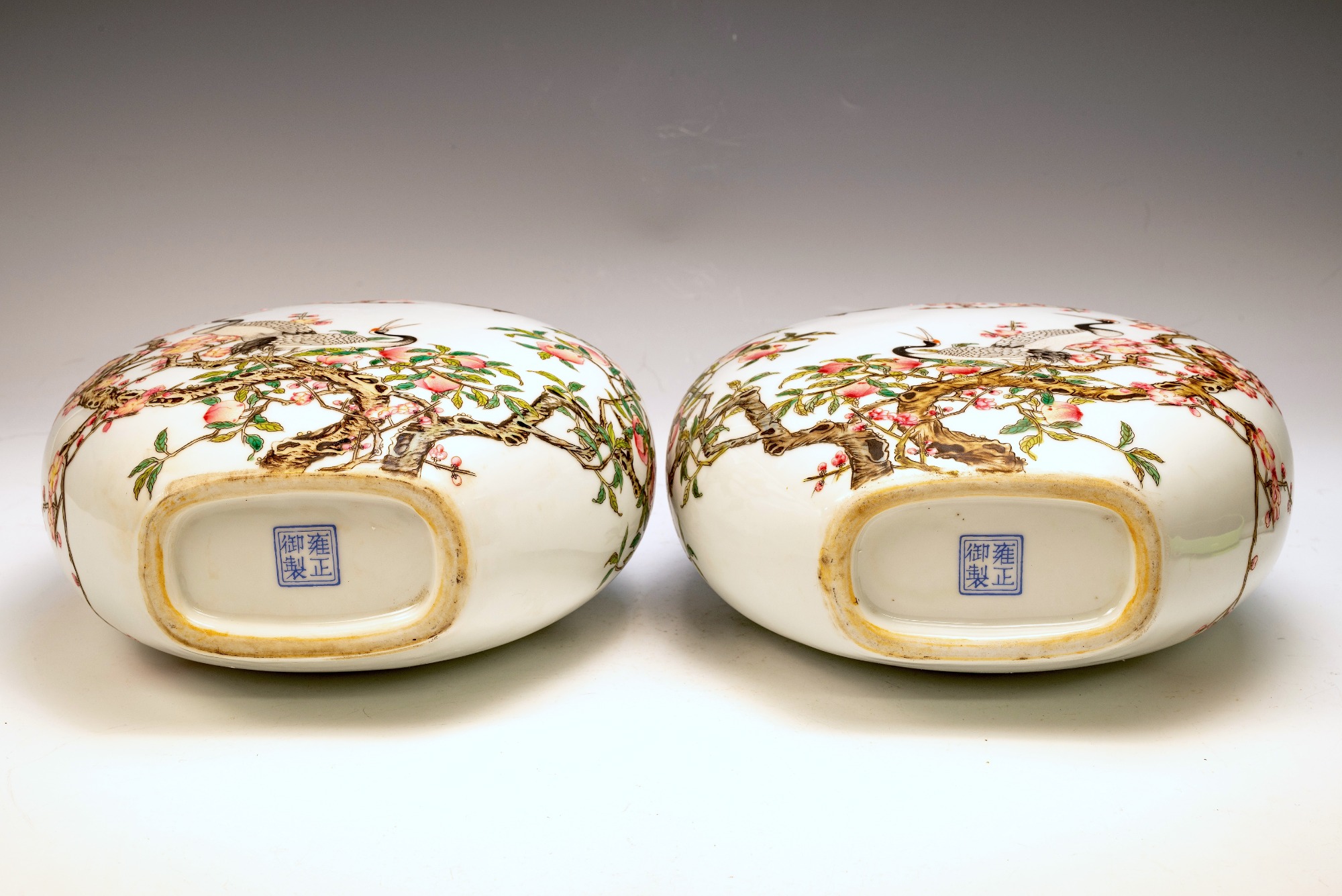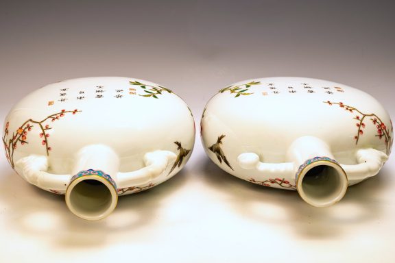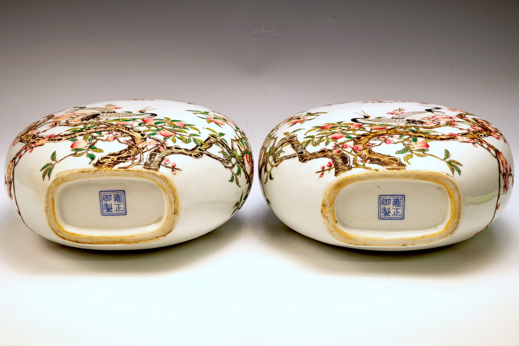 The Falangcai enamel Moon Flasks, renowned for their exceptional craftsmanship and artistry, were produced with meticulous attention to detail during the Yongzheng era, from 1723 to 1735, within the Forbidden City in Beijing. These artifacts represent the zenith of decorative arts, featuring remarkable Falangcai enamels, likely crafted under the direct supervision of the Emperor. The production of each flask necessitated an extraordinary degree of skill and precision. Every Moon Flask is adorned with intricate motifs of branches, peach blossoms, peaches, cranes, and magpies. The reverse side is embellished with an inscribed poem and three seals, adding layers of cultural depth. Marked by a blue enamel Yongzheng four-character Yuzhi mark within double squares on the base, these pieces clearly indicate their origins from Beijing's esteemed decorators. It is noteworthy that these Moon Flasks exhibit slight design variations, which are characteristic of typical Yongzheng wares, thereby enhancing their uniqueness. The presence of flaking in the biscuit further attests to their historical significance and age. The artist's exceptional craftsmanship is manifest in every detail, establishing these Moon Flasks as magnificent representations of their genre. For discerning collectors, it is advisable to consult auction catalogs, academic literature, and museum collections to assess the rarity of a comparable pair of Yongzheng Falangcai Moon Flasks that may be available. This particular pair measures approximately 10 1/2 inches in height. ppjrs