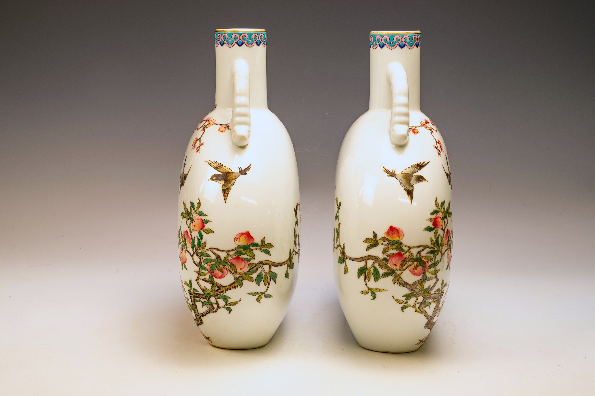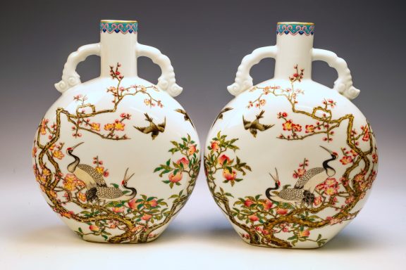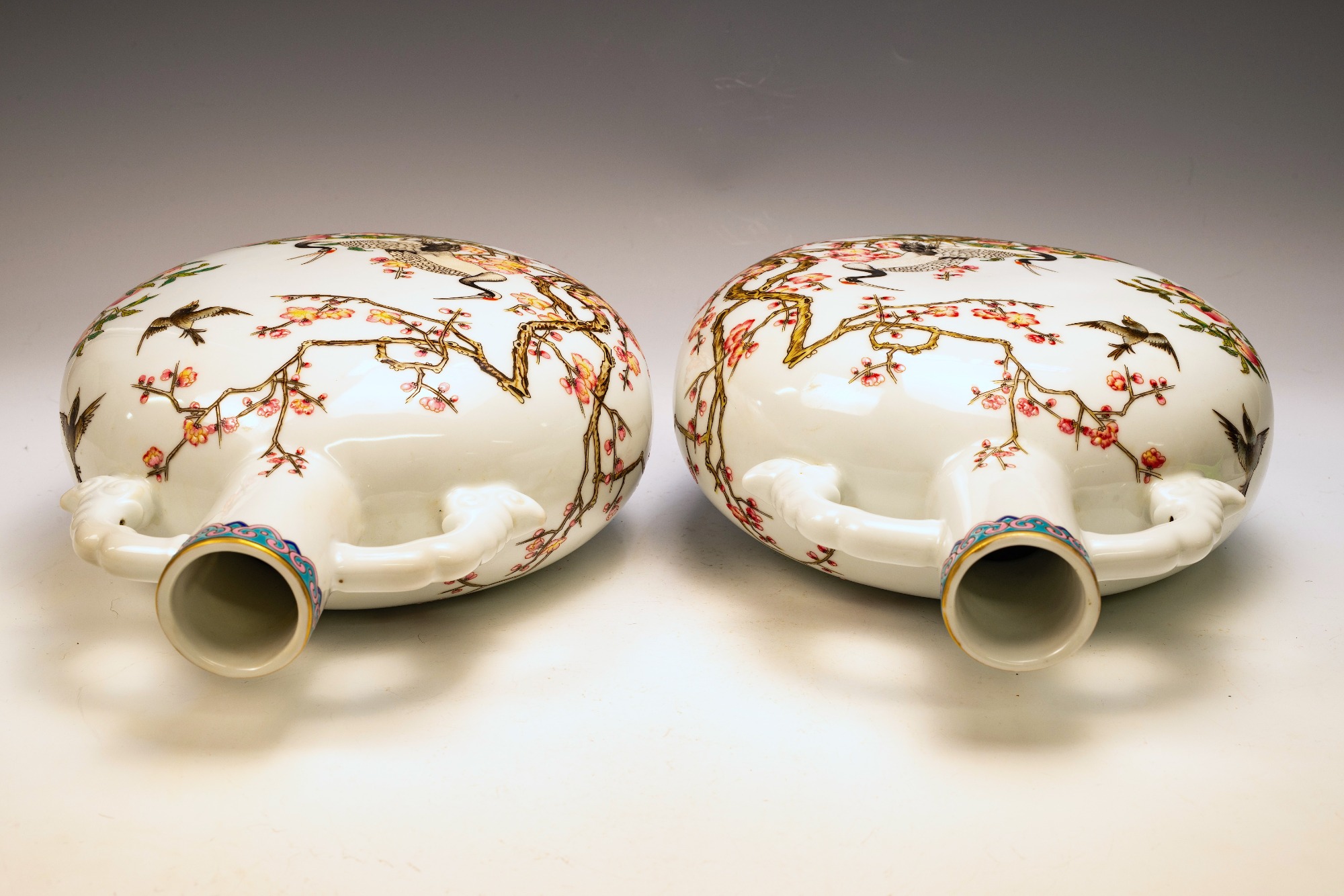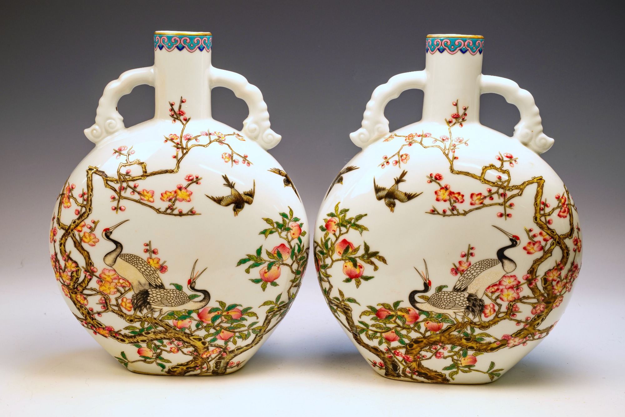 The Falangcai enamel Moon Flasks, renowned for their exceptional craftsmanship and artistry, were produced with meticulous attention to detail during the Yongzheng era, from 1723 to 1735, within the Forbidden City in Beijing. These artifacts represent the zenith of decorative arts, featuring remarkable Falangcai enamels, likely crafted under the direct supervision of the Emperor. The production of each flask necessitated an extraordinary degree of skill and precision. Every Moon Flask is adorned with intricate motifs of branches, peach blossoms, peaches, cranes, and magpies. The reverse side is embellished with an inscribed poem and three seals, adding layers of cultural depth. Marked by a blue enamel Yongzheng four-character Yuzhi mark within double squares on the base, these pieces clearly indicate their origins from Beijing's esteemed decorators. It is noteworthy that these Moon Flasks exhibit slight design variations, which are characteristic of typical Yongzheng wares, thereby enhancing their uniqueness. The presence of flaking in the biscuit further attests to their historical significance and age. The artist's exceptional craftsmanship is manifest in every detail, establishing these Moon Flasks as magnificent representations of their genre. For discerning collectors, it is advisable to consult auction catalogs, academic literature, and museum collections to assess the rarity of a comparable pair of Yongzheng Falangcai Moon Flasks that may be available. This particular pair measures approximately 10 1/2 inches in height. ppjrs