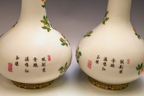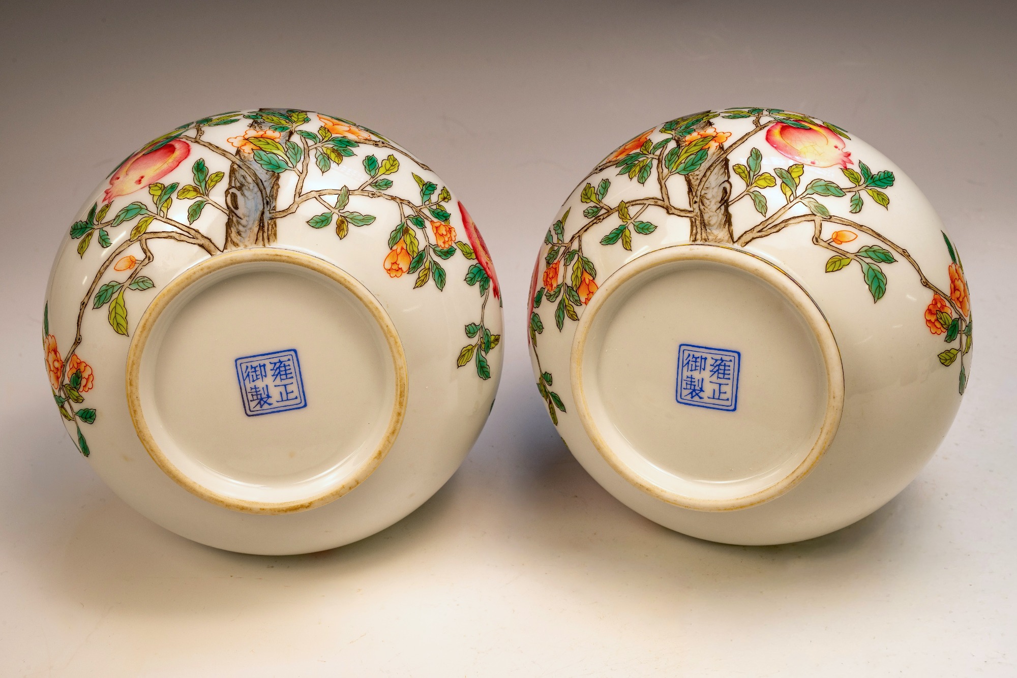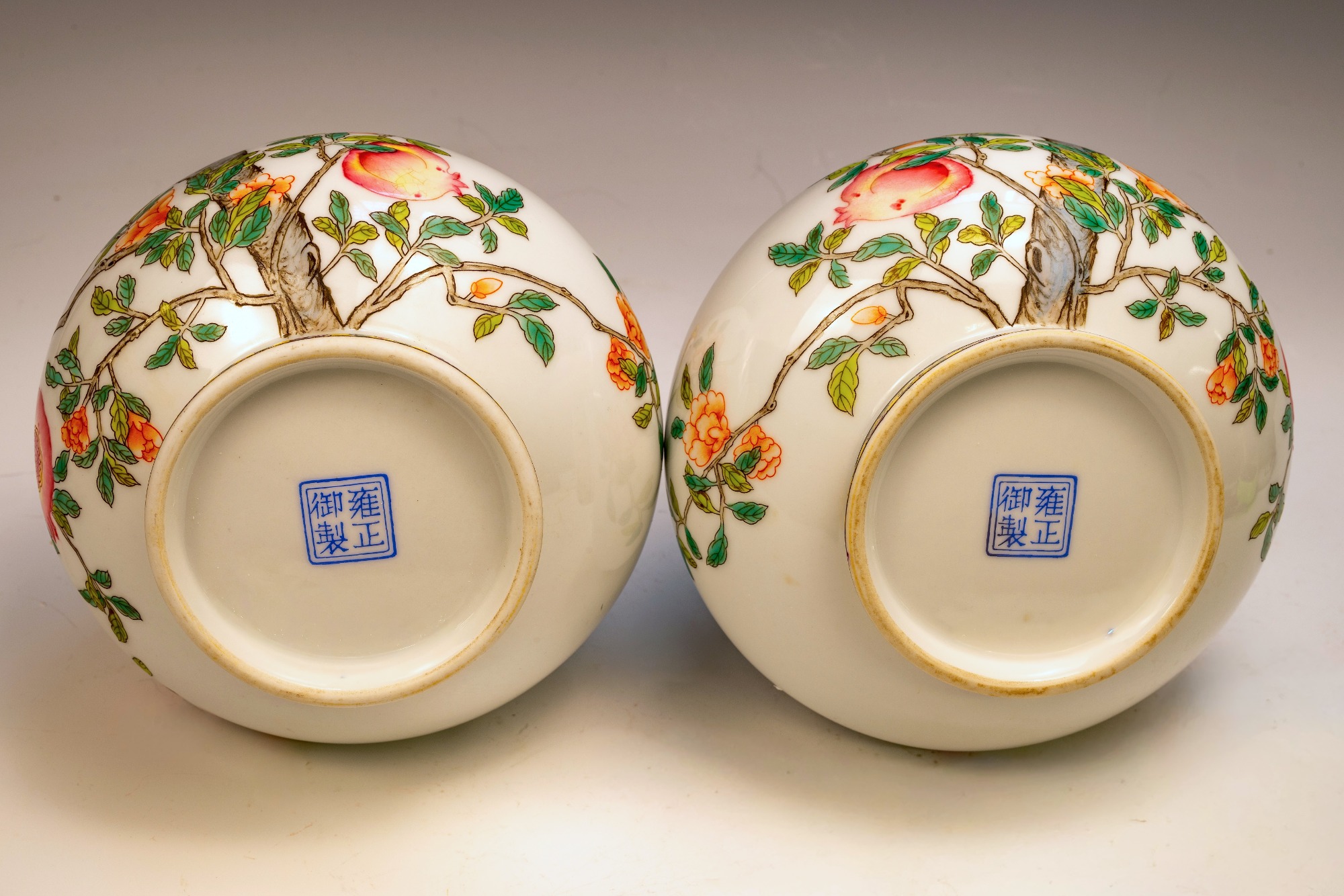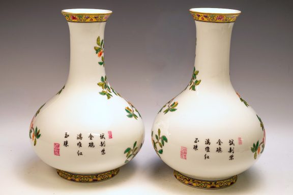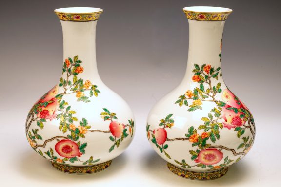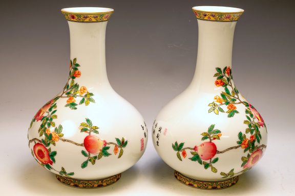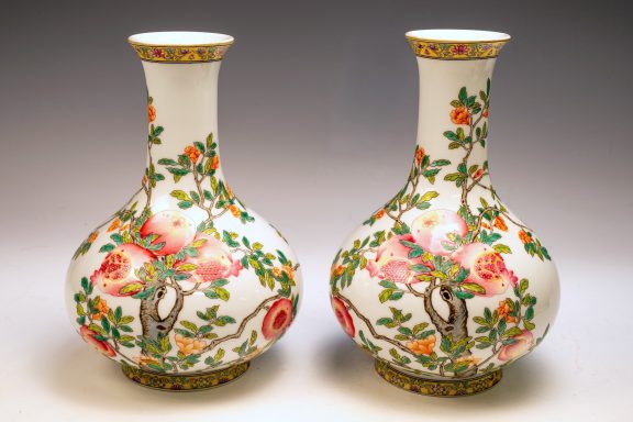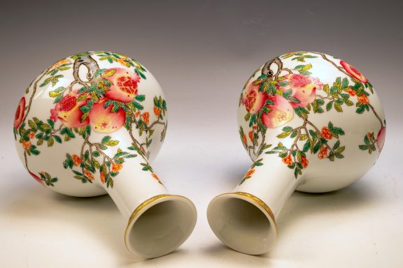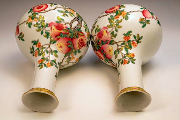 This exceptional pair of Yongzheng pomegranate pear-form vases, originating from the Qing Dynasty, is both marked and authentically representative of the period. Expertly crafted, these vases are distinguished by their elegant pear shape and utilize the falangcai palette, renowned for its vibrant colors and intricate detailing. Each vase features a meticulously rendered Pomegranate Tree with branches, blossoms, leaves, and fruit, showcasing the high caliber of artistry typical of falangcai enamels. Both vases are distinguished by the presence of the four-character Yongzheng Yuzhi mark, artistically inscribed in blue enamel within a double square, underscoring their quality and authenticity. It is imperative to acknowledge the meticulous craftsmanship apparent in the precise details, harmonious color balance, and skilled shading of these pieces. While evidence of some flaking is present in the biscuit—a testament to their age—the enamels exhibit typical crazing associated with falangcai wares, yet the overall color palette remains remarkably vibrant. Each vase stands at approximately 8.5 inches in height, further emphasizing their refined stature.