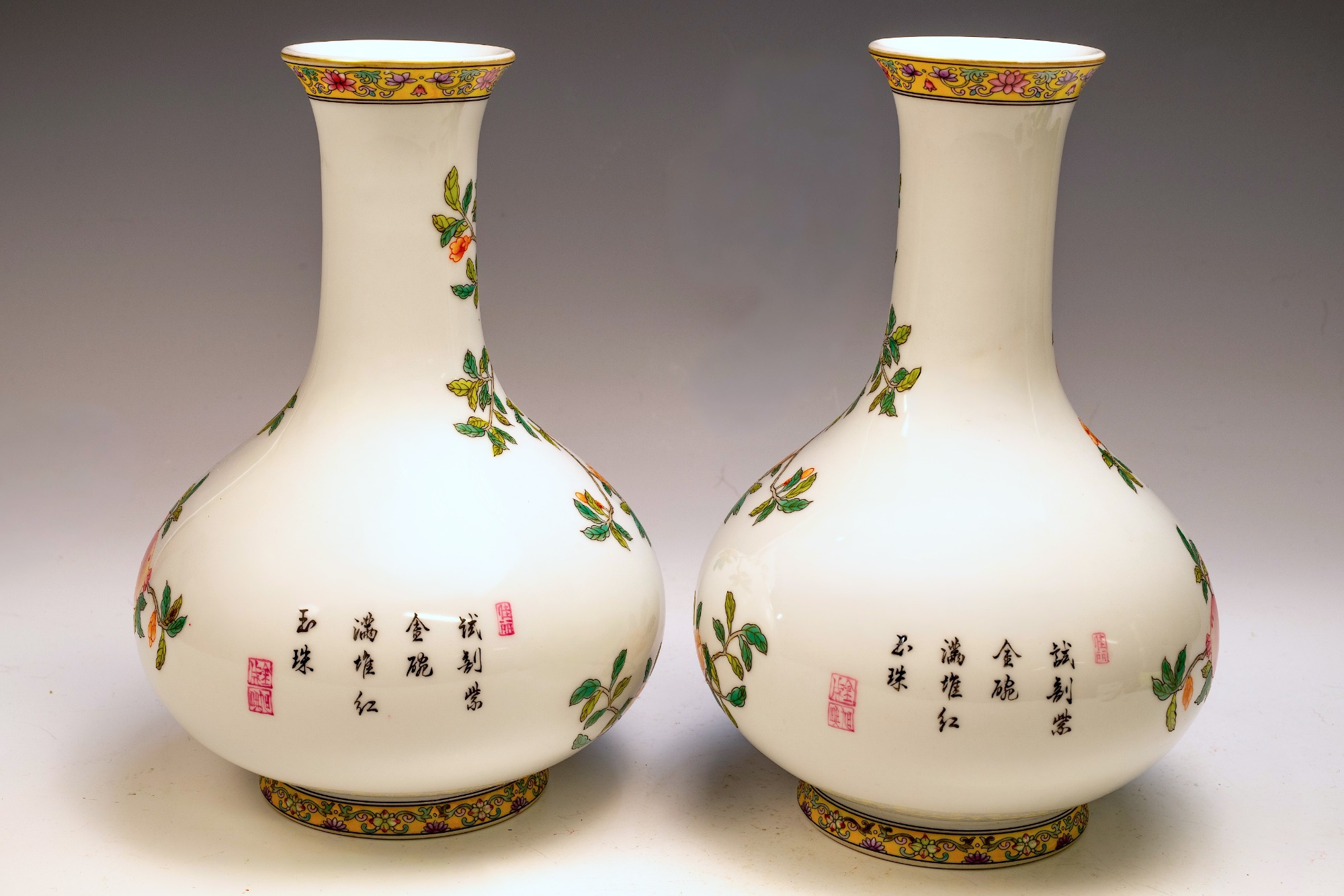 These remarkable Falangcai enamel vases exhibit an extraordinary thinness, measuring less than half the thickness of a dime at the rim. Crafted during the Yongzheng period (1723 to 1735) in the Forbidden City of Beijing, these vases showcase a remarkable artistry that is believed to have been directly overseen by the Emperor himself. The decoration features intricate motifs, including branches, flowering prunus, and birds, all rendered with the exceptional skill required for such delicate work. The distinctive palette characteristic of Yongzheng Falangcai enamels confers a unique identity to these pieces, facilitating their recognition among connoisseurs. On the reverse side, an inscribed poem accompanies three seals, further enriching the historical significance of the vases. The presence of the Yongzheng four-character mark, rendered in blue enamel within double squares on the base, attests to the authenticity of these artifacts, added by the decorators in Beijing. Notably, this pair of vases is not identical, which is consistent with typical Yongzheng creations. The artistry exhibited in these vases is exceptional, with their rim being so finely crafted that some may liken it to milk glass. The level of skill and precision involved in their production is indeed remarkable. The quality of these vases is outstanding; interested parties are encouraged to consult auction catalogs, scholarly publications, and museum collections to ascertain the rarity and excellence of such finely potted Yongzheng Falangcai vases. Each vase measures approximately 9 1/8 inches in height. ppjrs