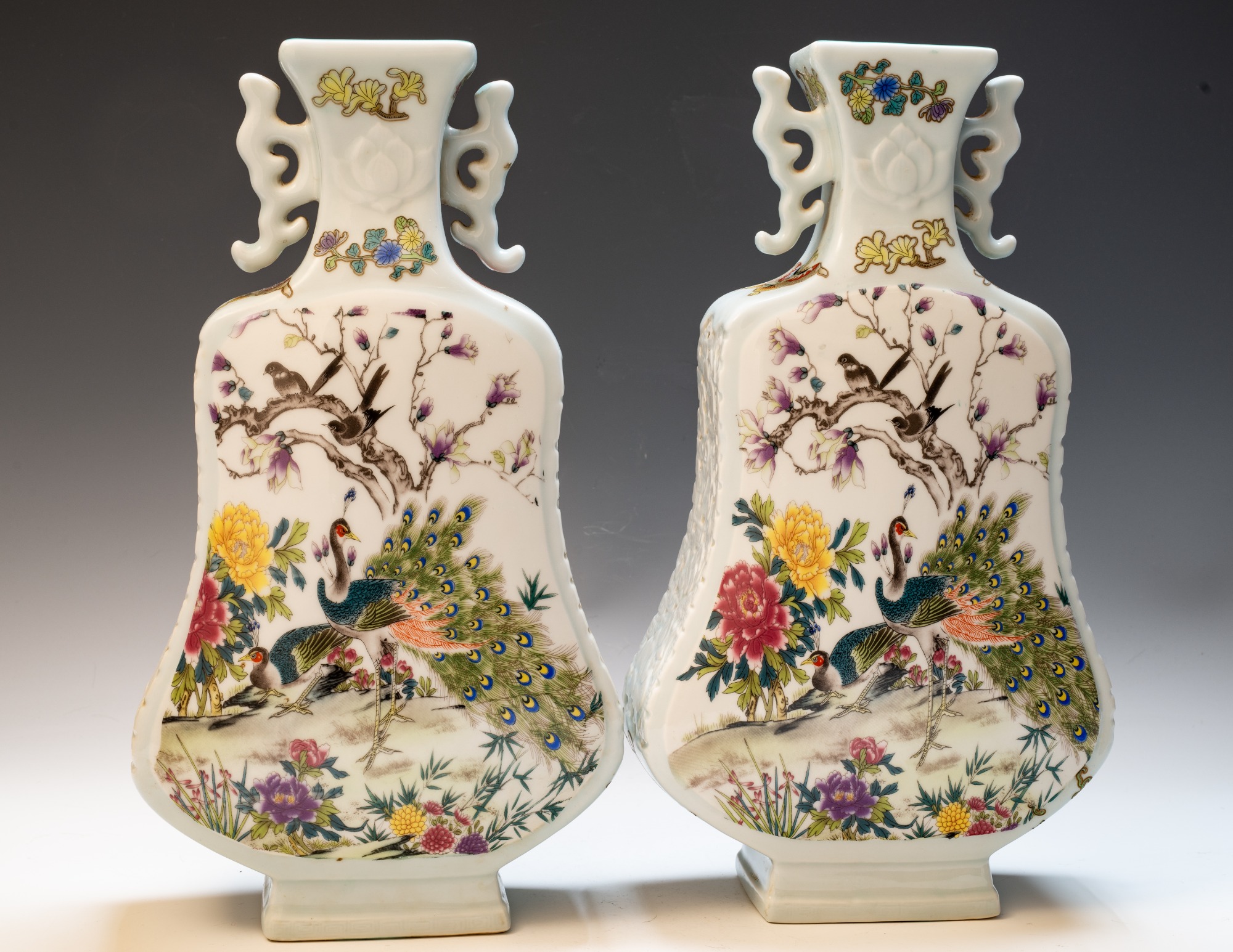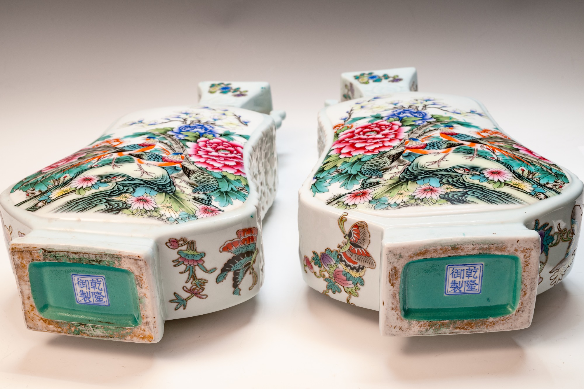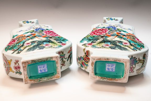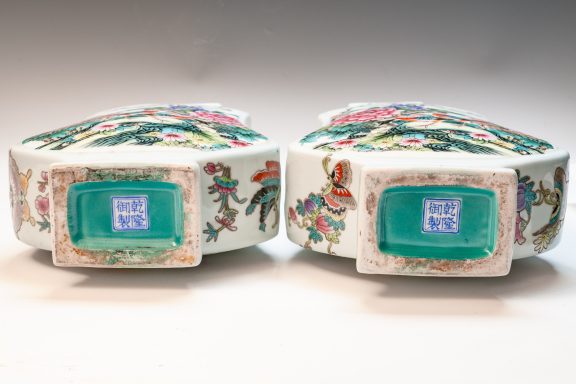 This distinguished pair of Chinese porcelain Famille Rose vases, crafted in the form of violins, showcases an exquisite attention to detail with depictions of birds, flowers, buds, branches, magpies, and peacocks. These fine Qing Dynasty Imperial vases are marked with the four-character Yuzhi mark enclosed in a double square, indicating their production during the esteemed Qianlong Period (1736–1795). The craftsmanship exemplified in these pieces is noteworthy; this era is renowned for yielding some of the finest examples of blown enamel porcelain, distinguished by intricate decorations that illustrate the zenith of artistic achievement in this medium. The layers of detailed embellishment reflect the artist's exceptional skill, contributing to the vases' distinctive visual texture. The foliage, branches, blossoms, and avian figures are executed with remarkable delicacy. A meticulous examination—ideally utilizing magnification—of the leaves, flowers, and branches uncovers a profound depth of detail, vibrant colors, and nuanced shading that collectively enhance the piece’s overall balance and richness. Recognizing these elements of attention to detail, color harmony, and shading is critical for appreciating the artistry involved. It is significant to note that the base prominently features the Qianlong mark, which is centered in relation to the primary decoration—a characteristic hallmark of Imperial Qianlong porcelain. Standing at approximately 15 3/8 inches in height, these vases represent an impressive and valuable addition to any discerning collection. ppjrs