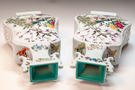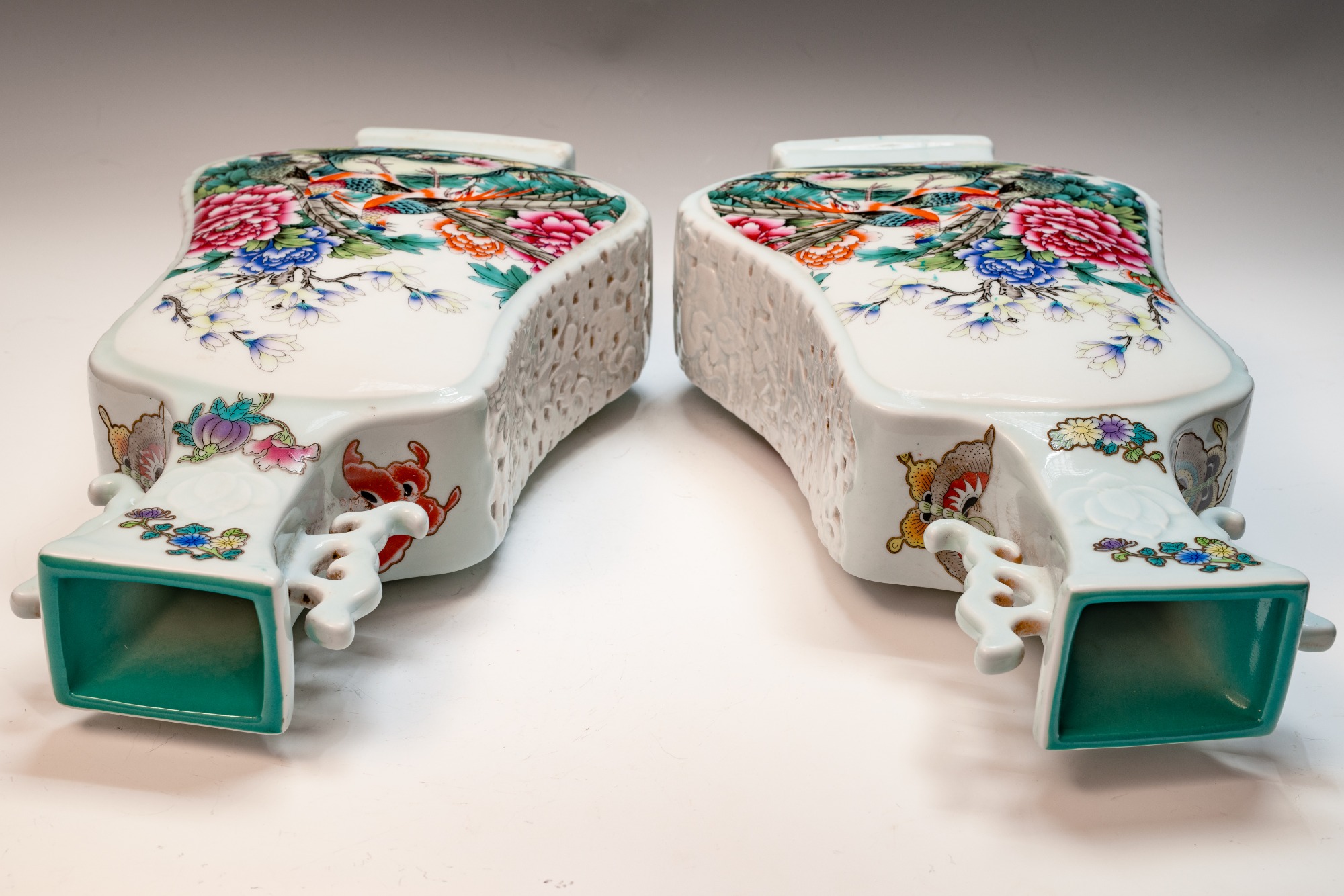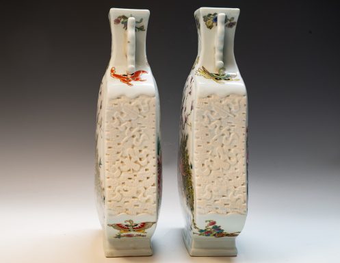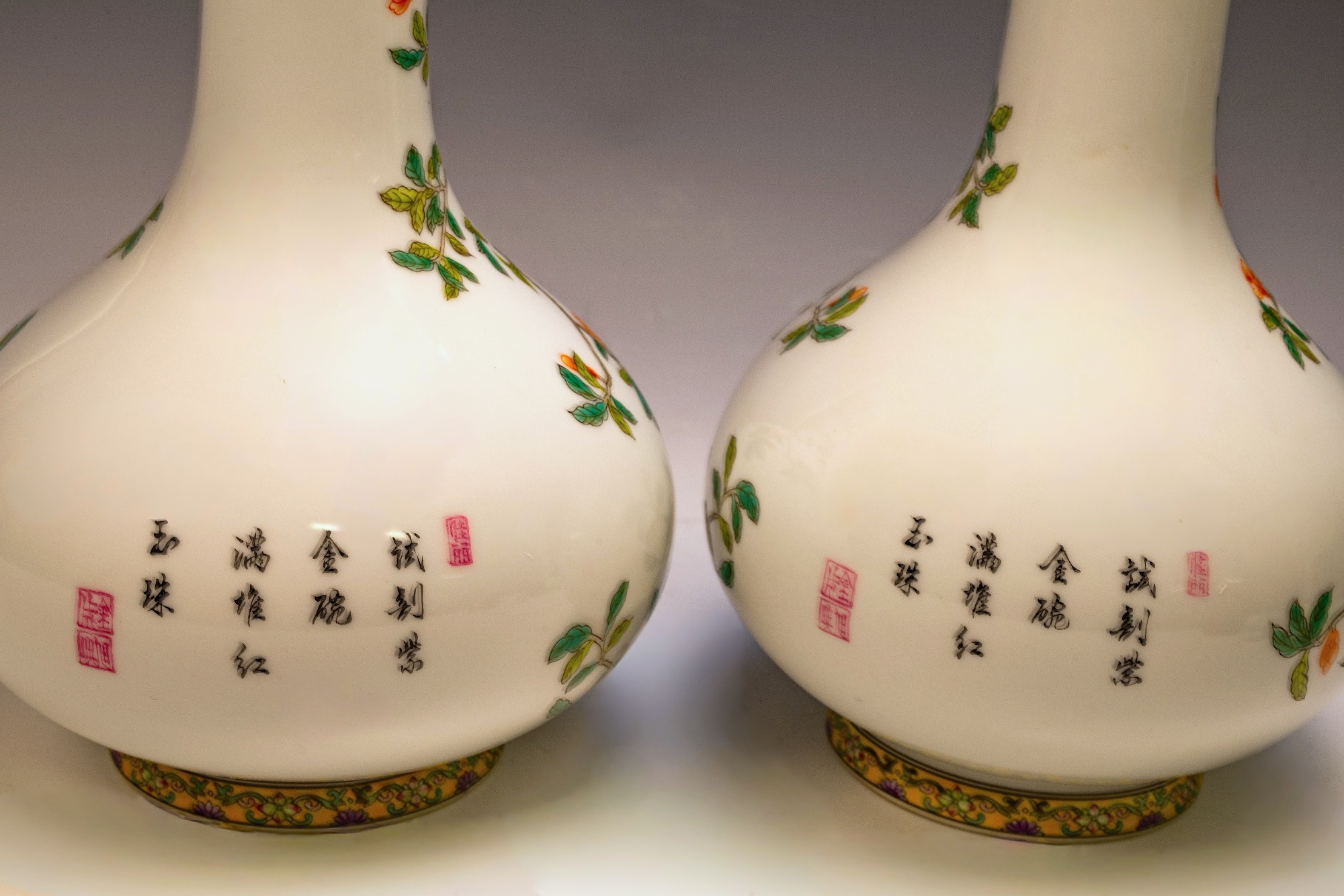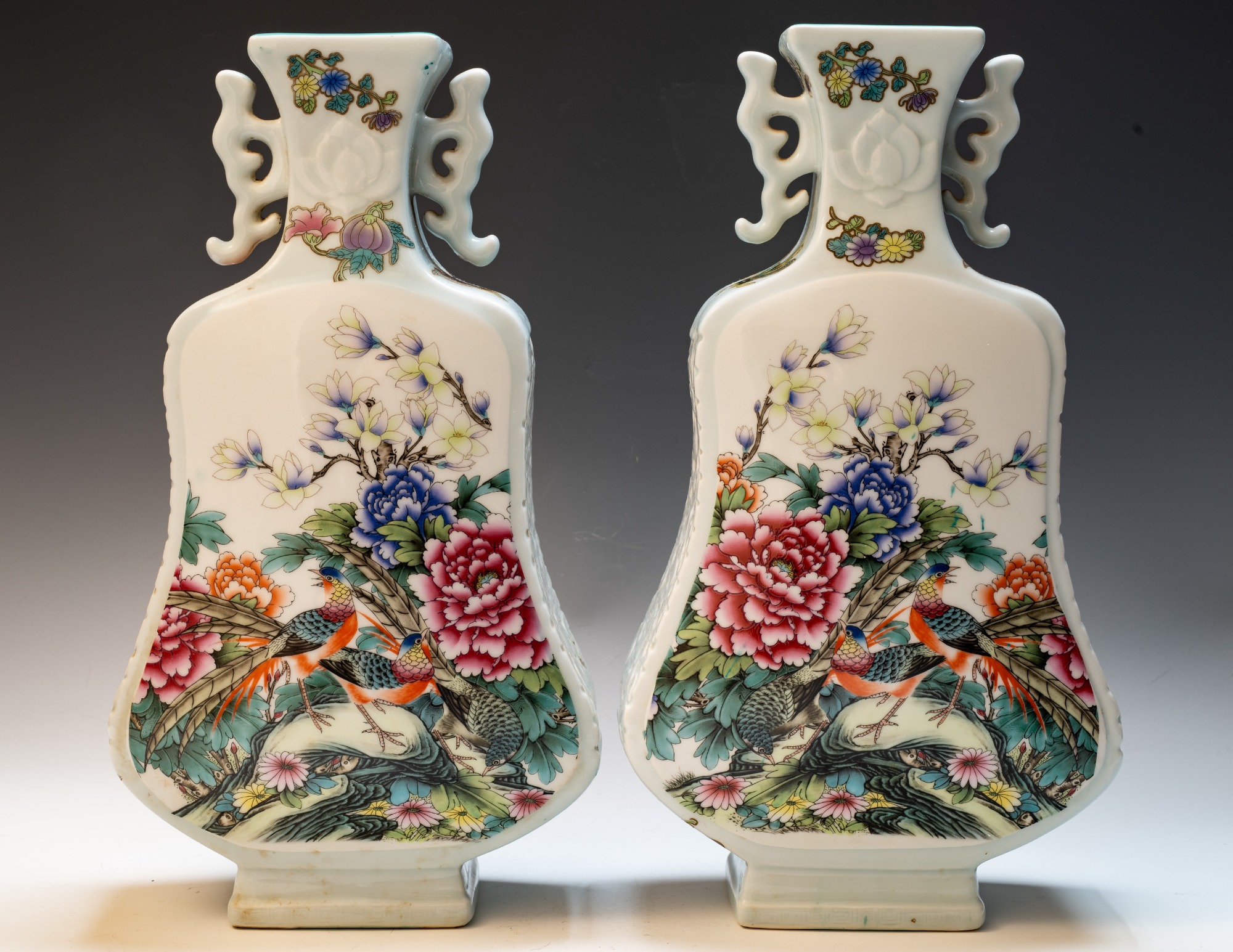 This distinguished pair of Chinese porcelain Famille Rose vases, crafted in the form of violins, showcases an exquisite attention to detail with depictions of birds, flowers, buds, branches, magpies, and peacocks. These fine Qing Dynasty Imperial vases are marked with the four-character Yuzhi mark enclosed in a double square, indicating their production during the esteemed Qianlong Period (1736–1795). The craftsmanship exemplified in these pieces is noteworthy; this era is renowned for yielding some of the finest examples of blown enamel porcelain, distinguished by intricate decorations that illustrate the zenith of artistic achievement in this medium. The layers of detailed embellishment reflect the artist's exceptional skill, contributing to the vases' distinctive visual texture. The foliage, branches, blossoms, and avian figures are executed with remarkable delicacy. A meticulous examination—ideally utilizing magnification—of the leaves, flowers, and branches uncovers a profound depth of detail, vibrant colors, and nuanced shading that collectively enhance the piece’s overall balance and richness. Recognizing these elements of attention to detail, color harmony, and shading is critical for appreciating the artistry involved. It is significant to note that the base prominently features the Qianlong mark, which is centered in relation to the primary decoration—a characteristic hallmark of Imperial Qianlong porcelain. Standing at approximately 15 3/8 inches in height, these vases represent an impressive and valuable addition to any discerning collection. ppjrs