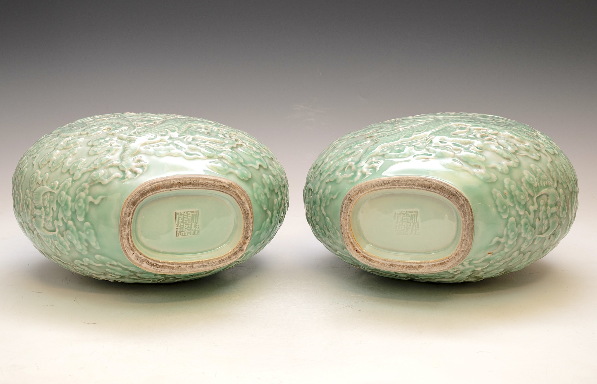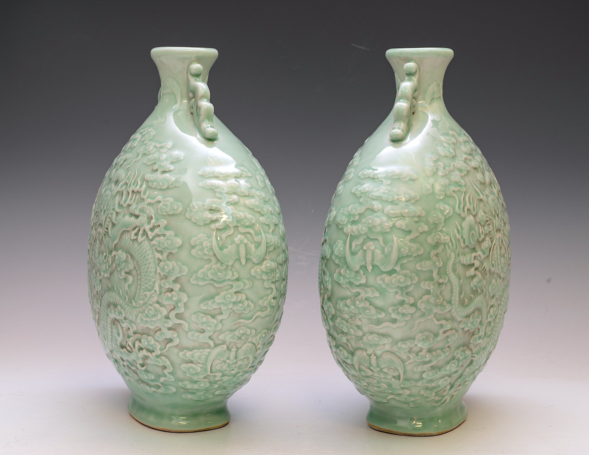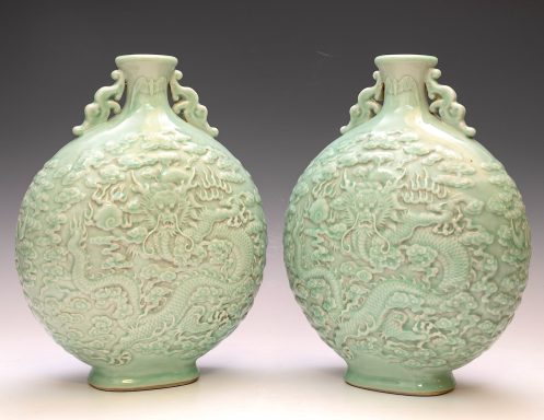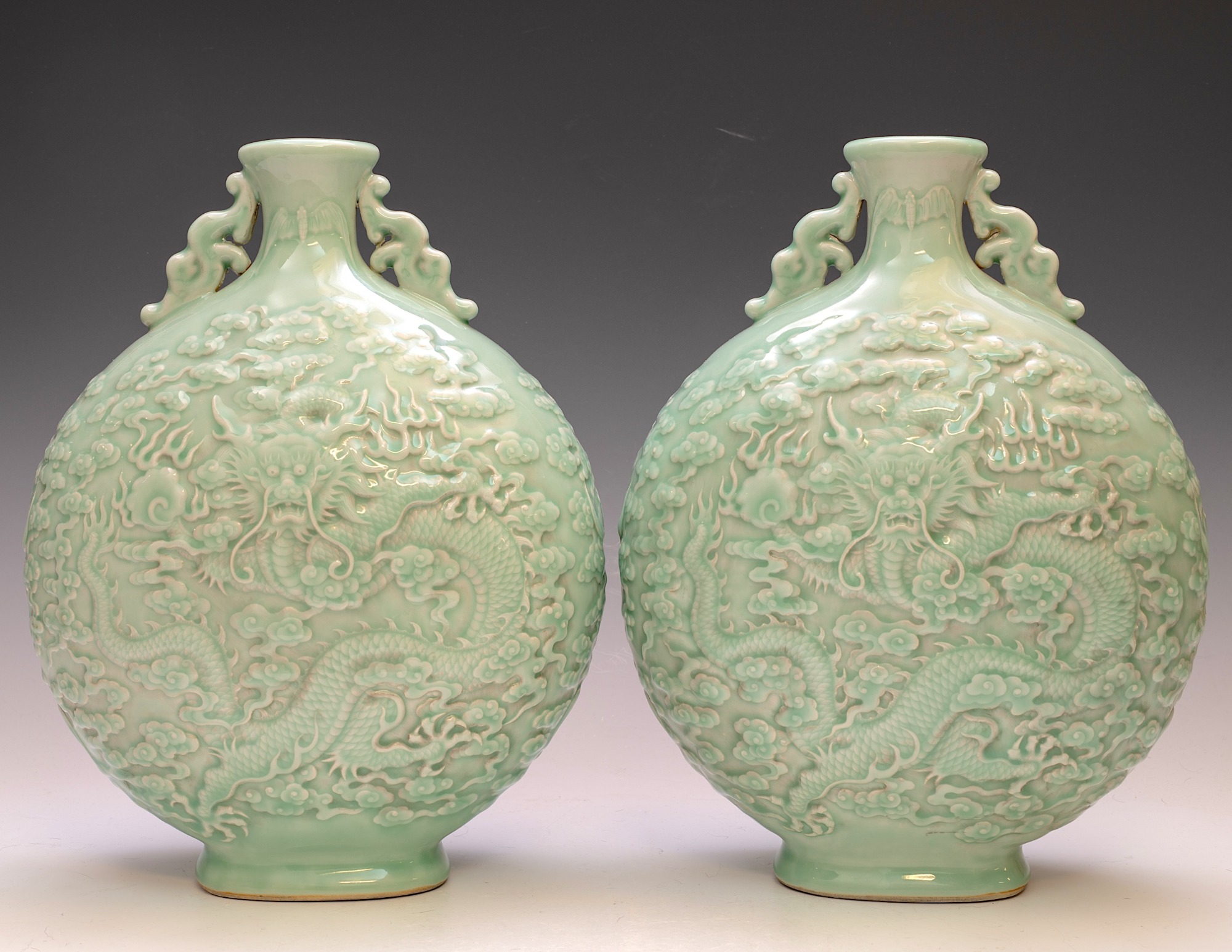 These distinguished vases, attributed to the Qianlong period, are elegantly designed in the form of a Moon Flask. They feature intricately impressed and carved five-clawed dragons, skillfully navigating through stylized clouds, with a flaming pearl—elements that exemplify the exceptional craftsmanship typical of this era. The vases are finished with a refined celadon glaze and are further enhanced by two meticulously designed dragon handles. Each piece prominently displays the impressed Qianlong seal mark, which harmonizes with the facing dragon motif, a signature characteristic of Qianlong ceramics. The height of each vase is approximately 12 3/4 inches. ppjrs