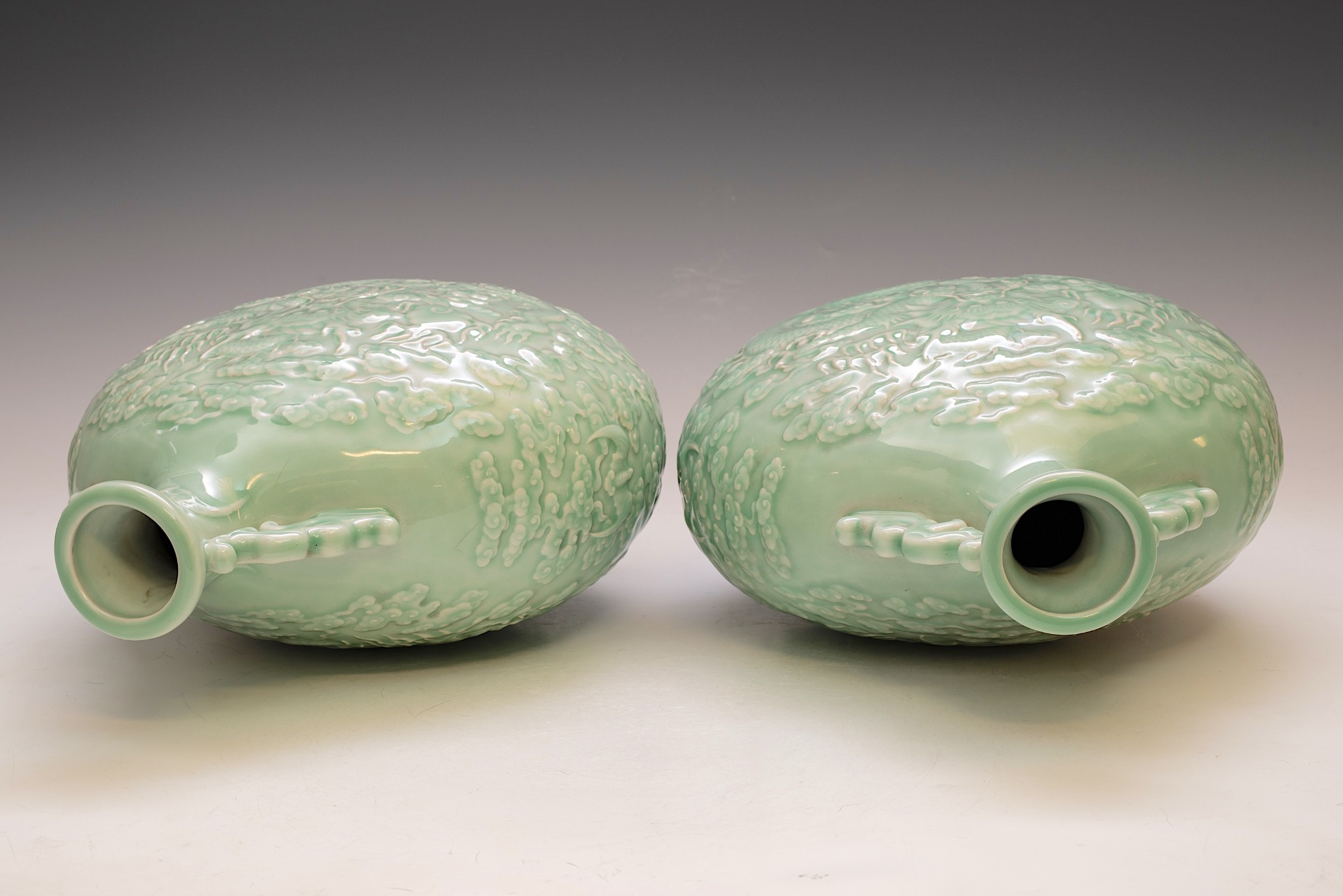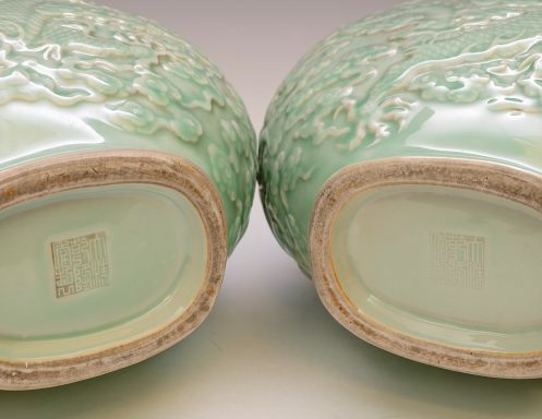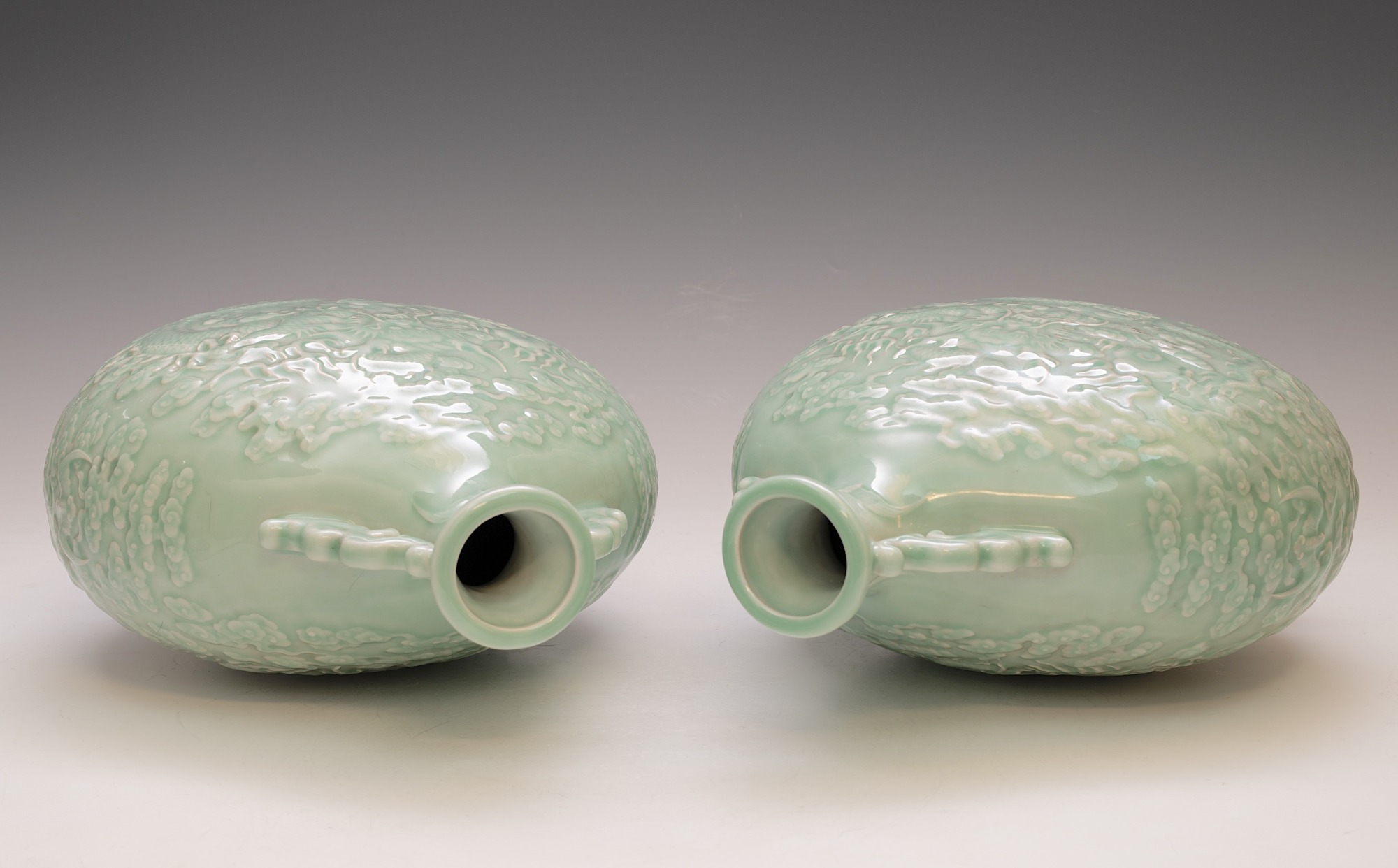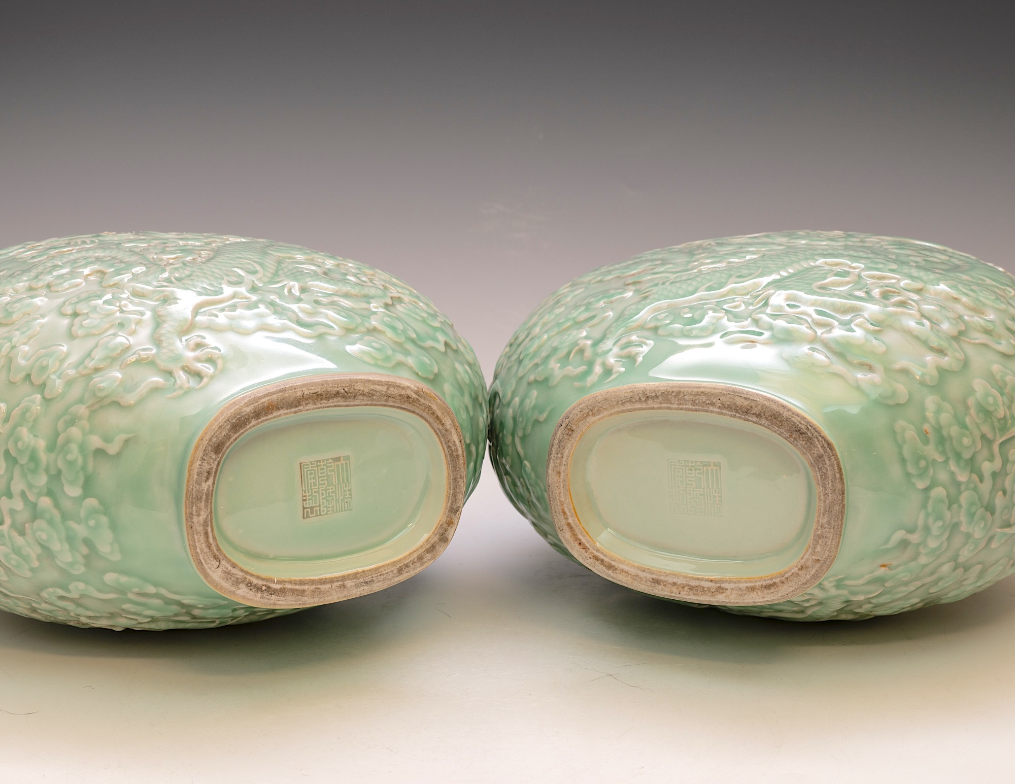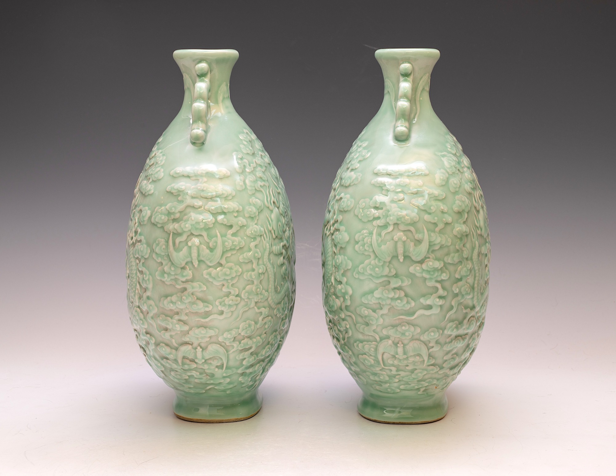 These distinguished vases, attributed to the Qianlong period, are elegantly designed in the form of a Moon Flask. They feature intricately impressed and carved five-clawed dragons, skillfully navigating through stylized clouds, with a flaming pearl—elements that exemplify the exceptional craftsmanship typical of this era. The vases are finished with a refined celadon glaze and are further enhanced by two meticulously designed dragon handles. Each piece prominently displays the impressed Qianlong seal mark, which harmonizes with the facing dragon motif, a signature characteristic of Qianlong ceramics. The height of each vase is approximately 12 3/4 inches. ppjrs