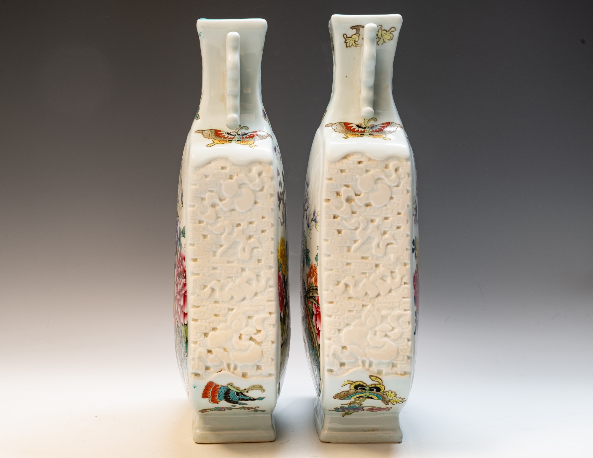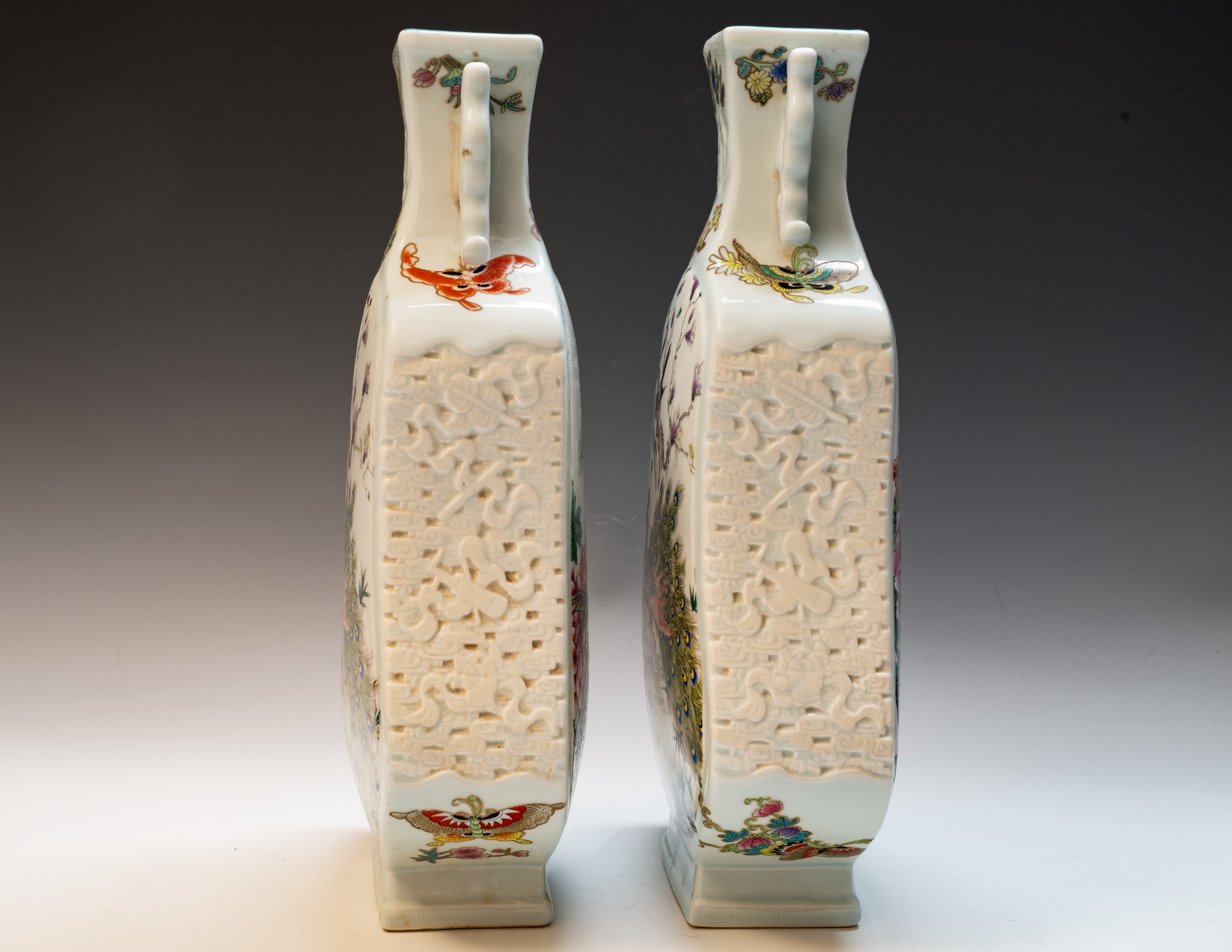 These exquisite Falangcai enamel vases, notable for their exceptionally thin porcelain bodies, were crafted in the Forbidden City, Beijing, during the Yongzheng period, specifically between 1723 and 1735. The vases are adorned with intricate designs executed in Falangcai enamels, with historical accounts indicating that the Emperor closely supervised their production. The artistic skill and precision required for their creation are evident; an examination of the vases reveals definitive characteristics of a masterful Chinese ceramic work. Prospective collectors are advised to scrutinize the detailed depictions of leaves, flowers, and branches. Close examination will reveal the exquisite color gradation and shading that confer balance and depth to these vases. Collectors need to distinguish between ordinary pieces and exceptional masterpieces. A comparative analysis of Qing ceramics often reveals that many were executed by less proficient artists, resulting in flat appearances with insufficient detail and balance. Paying meticulous attention to these elements of color and shading is vital for discerning quality in ceramic art. The delicate nature of these vases is further enhanced by their decoration, which features branches, flowering prunus, and avian motifs. The Yongzheng Falangcai color palette is distinctly recognizable. Evidence of age is apparent in the form of flaking within the biscuit. Additionally, the reverse side bears an inscribed poem along with three seals. The base is marked with the Yongzheng four-character mark, rendered in blue enamel within double squares, a hallmark of the Beijing decorators. It is noteworthy that this pair of vases is not identical, which is characteristic of Yongzheng productions. The birds depicted on these vases display unparalleled artistry, with the feathers meticulously illustrated through over a thousand minuscule strokes executed with a single-hair brush, a detail that can only be appreciated under magnification. Close examination of the photographs will reveal the intricate strokes, particularly given that the birds' bodies measure merely ½ inch in width. The artist's exceptional skill and control are truly exemplary. The quality of these vases is remarkable; verification of their distinction can be undertaken through auction catalogs, reference texts, and museum collections to ascertain if any superior examples of Yongzheng Falangcai vases are documented. The vases stand at an approximate height of 8 3/8 inches.