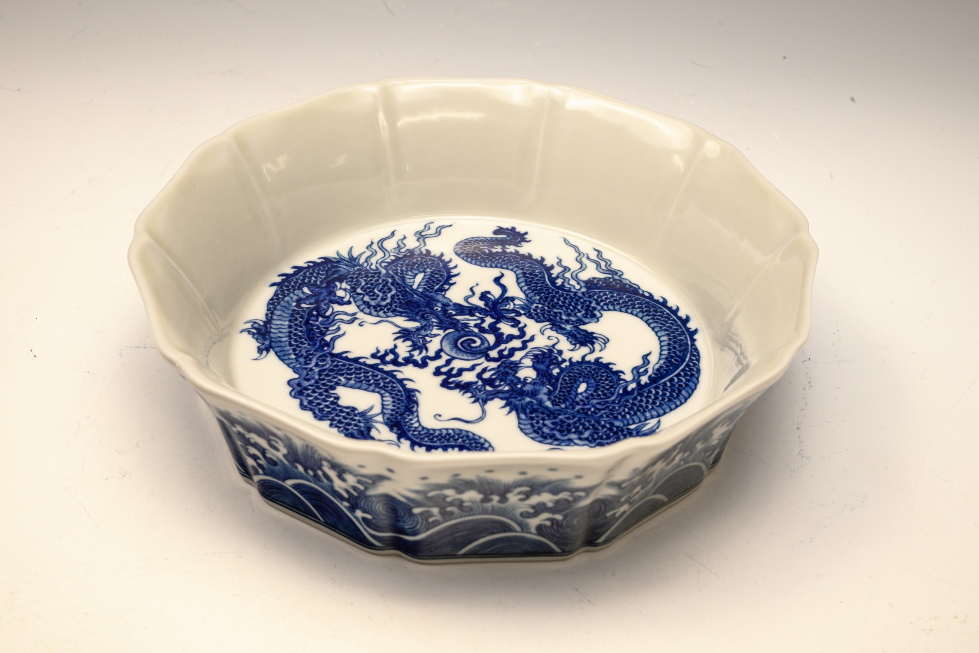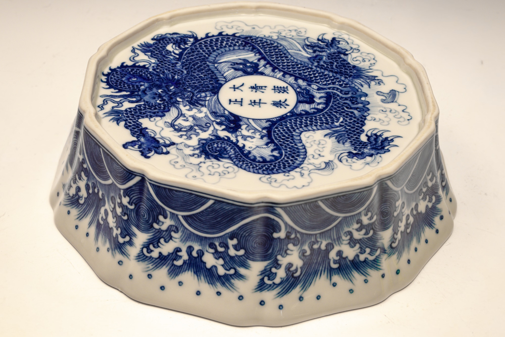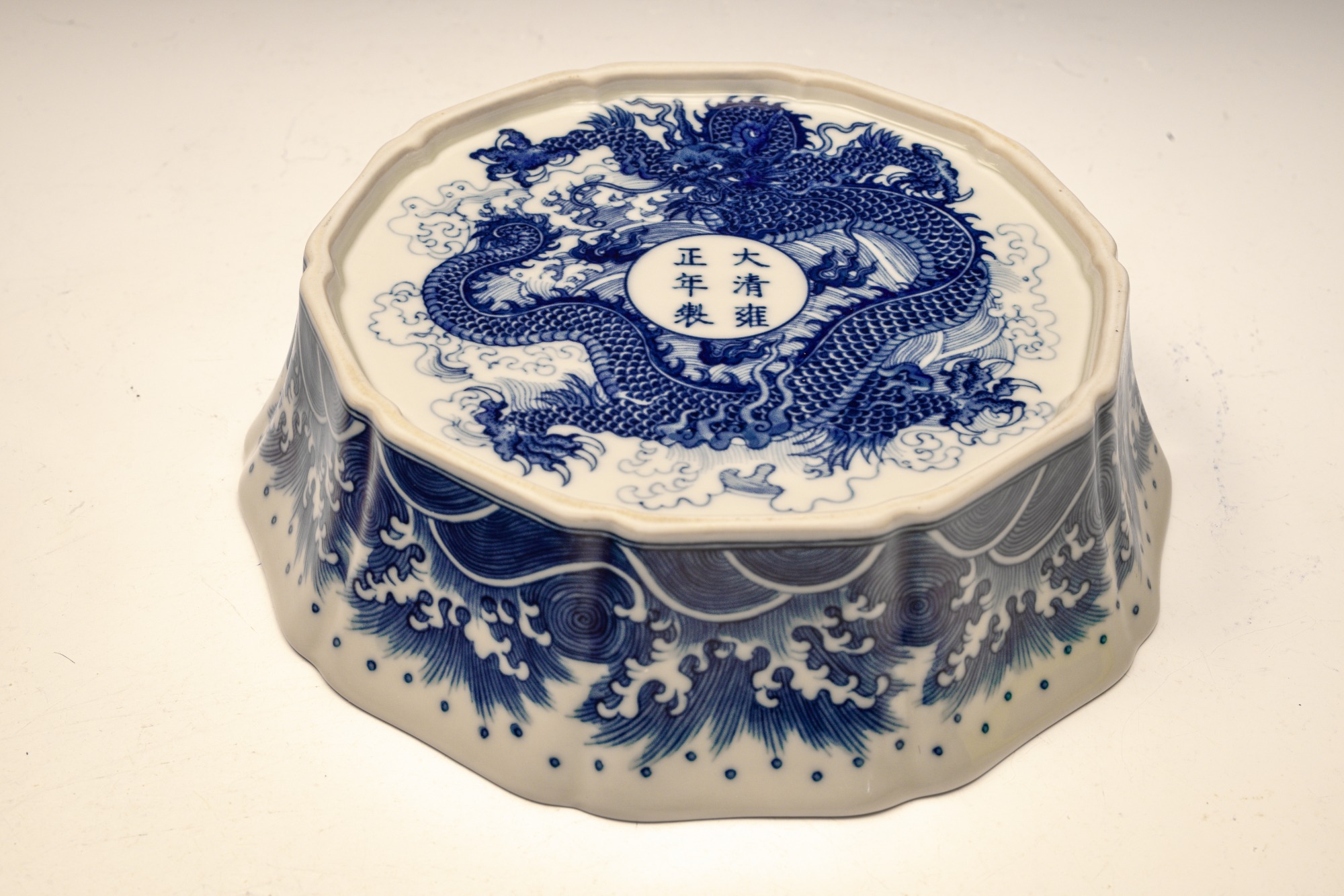 This distinguished blue and white lobed brush washer, marked and produced during the Yongzheng period of the Qing Dynasty, exemplifies exceptional artistry and craftsmanship. The piece features intricate details, with the interior showcasing two confronting dragons encircling a flaming pearl. The exterior is adorned with a meticulously rendered wave pattern, while the base is decorated with a singular dragon amidst waves, encircling the six-character Yongzheng mark within a discrete circle. The artist's remarkable attention to detail is evident in the precise application of cobalt, as well as the balanced composition and shading employed throughout the piece. This Yongzheng brush washer measures approximately 7 3/4 inches in diameter. ppjrs