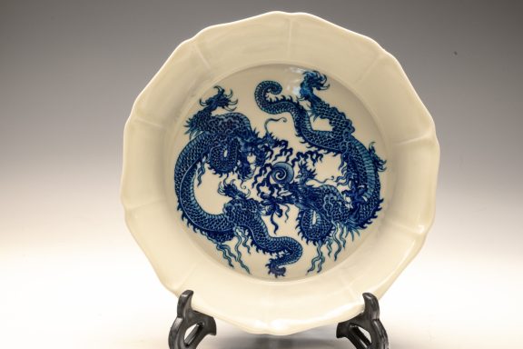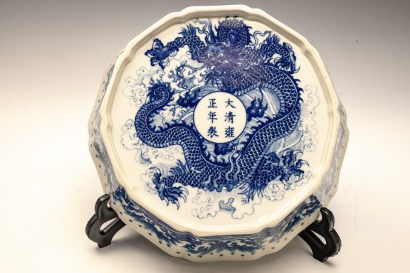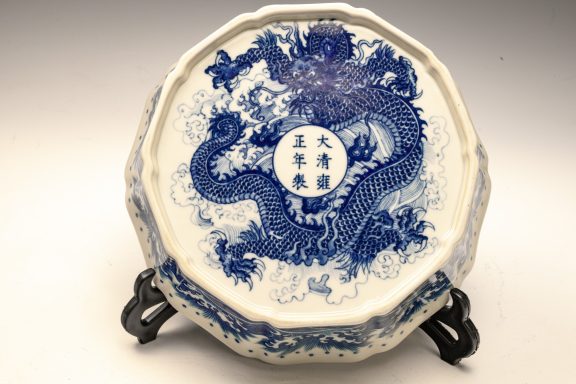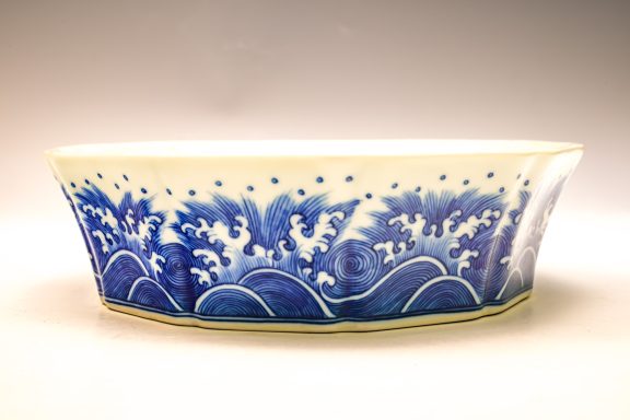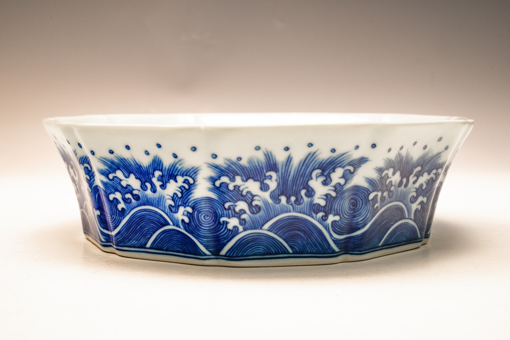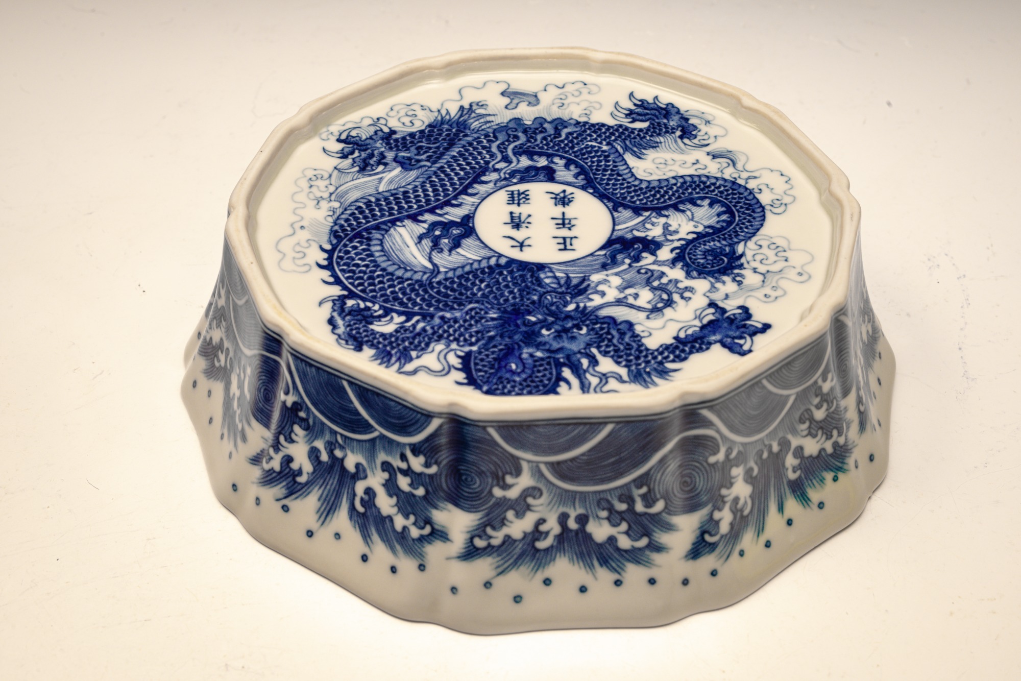 This distinguished blue and white lobed brush washer, marked and produced during the Yongzheng period of the Qing Dynasty, exemplifies exceptional artistry and craftsmanship. The piece features intricate details, with the interior showcasing two confronting dragons encircling a flaming pearl. The exterior is adorned with a meticulously rendered wave pattern, while the base is decorated with a singular dragon amidst waves, encircling the six-character Yongzheng mark within a discrete circle. The artist's remarkable attention to detail is evident in the precise application of cobalt, as well as the balanced composition and shading employed throughout the piece. This Yongzheng brush washer measures approximately 7 3/4 inches in diameter. ppjrs