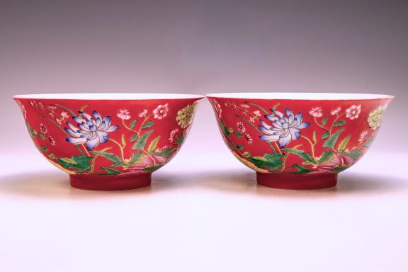This Qing Dynasty Kangxi Falangcai bowl exhibits an exquisite form and craftsmanship. The piece features a robust falangcai palette adorned with vibrant colored enamels on the floral motifs, complemented by a more delicate enamel shading in green tones that enhances the lotus pads. Notably, the bowl displays subtle crazing in the flowers alongside a rich ruby red ground, underscoring its artistic merit. Careful attention to detail, along with an impressive balance of colors and shading, characterizes this exceptional piece. Kangxi falangcai bowls are often distinguished by fine crazing within their enamel surfaces, a feature present in this bowl, which also exhibits some flaking in the biscuit, indicating its age and authenticity. The color palette employed in Kangxi falangcai pieces is indeed striking. Additionally, this bowl bears the four-character yuzhi mark of the Kangxi period, presented in a double square format on the base. This meticulously crafted Kangxi bowl measures approximately 6 1/8 inches in diameter. ppjrs
