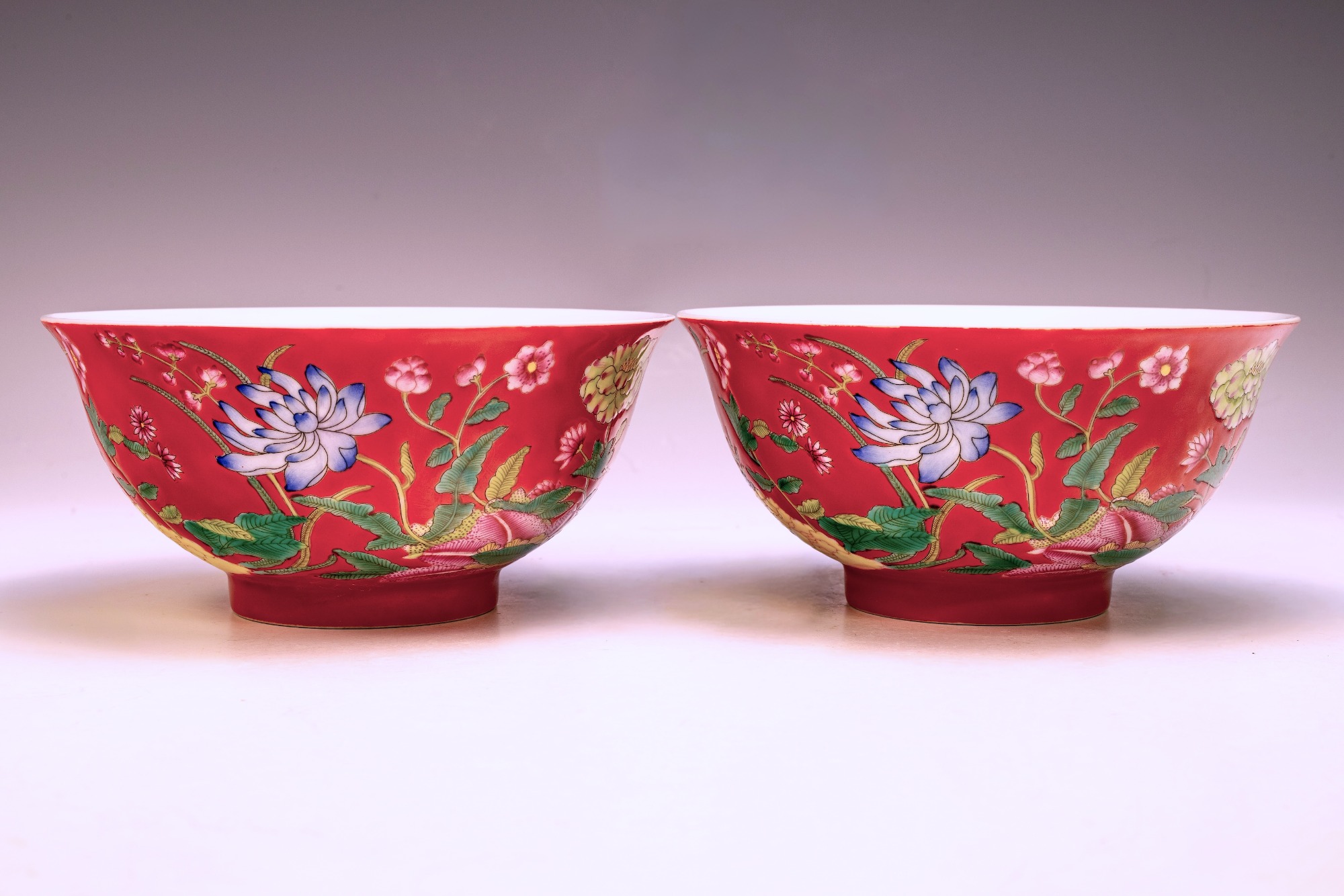 This distinguished pair of marked and period Yongzheng bowls from the Qing Dynasty displays exquisite craftsmanship, employing a falangcai palette of vibrant enamels. The bowls feature a striking pink ground adorned with four blue panels, each shaped like Chinese characters, and illustrate motifs of bats and peaches within these panels. Notably, each bowl includes a peach design on its interior and base, marked with the four-character Yongzheng gold inscription that owns the peach motif. Attention to detail is evident in the careful application of color, balance, and shading throughout these pieces. The bowls exhibit signs of flaking in the biscuit, which attest to their antiquity. Additionally, falangcai enamels are characterized by the presence of fine crazing, a feature these bowls distinctly possess, enhancing their aesthetic appeal. The overall color palette of the falangcai enamels adds to the beauty of this remarkable craftsmanship. Each Yongzheng bowl measures approximately 6 1/4 inches in diameter. ppjrs