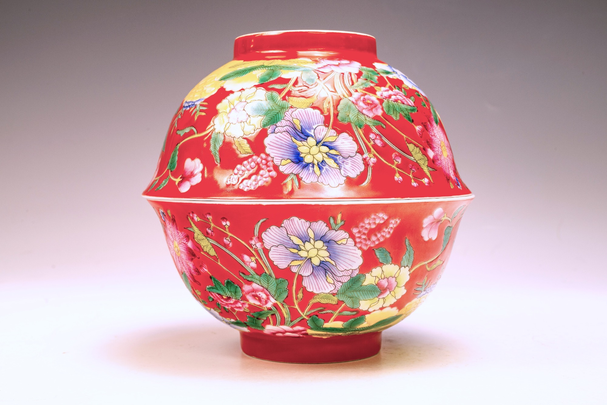 This exceptional Kangxi Falangcai bowl, marked from the Qing Dynasty, exhibits an exquisite form and design. The piece features a rich ruby red ground adorned with a splendid palette of vibrant enamels, including delicate pinks and yellows, cascading across the floral motifs, complemented by verdant green tones that enhance the vines and leaves. The meticulous attention to detail, particularly in the color balance and shading, is noteworthy. Falangcai enamels are often characterized by fine crazing, a feature present in this bowl, further attesting to its authenticity and age, as evidenced by the flaking observed in the biscuit. The bowl also showcases the remarkable beauty of the Falangcai color palette. Importantly, the base is marked with the Kangxi four-character puce enamel yuzhi mark enclosed in a double square, confirming its provenance. This Kangxi bowl is exceptionally crafted, with a diameter of approximately 6 3/16 inches, making it a remarkable addition to any collection. ppjrs