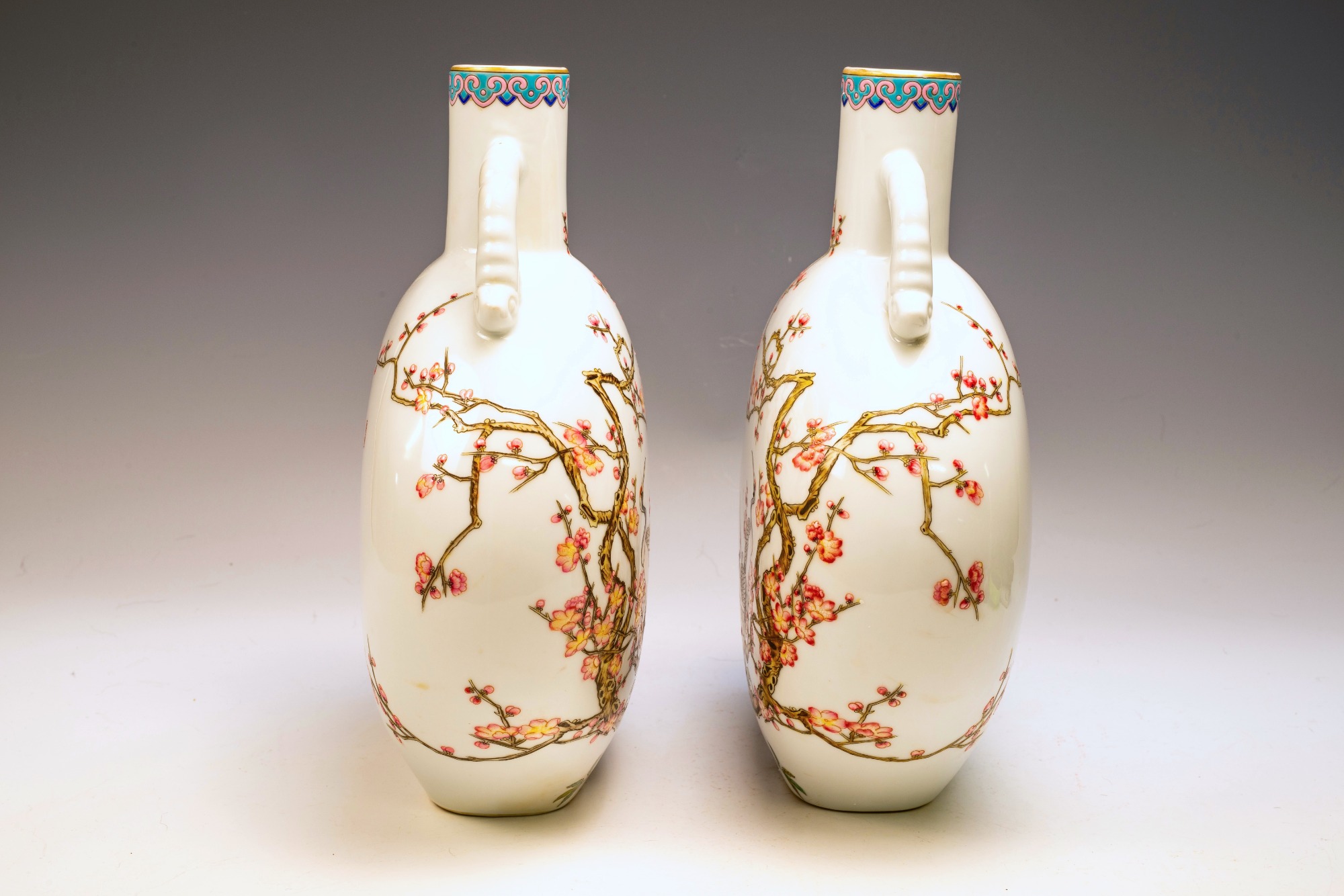 These exceptional Falangcai enamel vases are masterfully crafted and intricately painted, originating from the Forbidden City in Beijing during the Yongzheng period, specifically between 1723 and 1735. The vases were produced using the Falangcai enamel technique, asserted to have been supervised directly by the Emperor. The creation of these vases required exceptional skill and precision. The decoration features branches adorned with flowering prunus and magpie birds, exemplifying the distinct Yongzheng color palette. A poem is inscribed on the reverse side, accompanied by three seals. Additionally, the vases bear the Yongzheng four-character Yuzhi mark in blue enamel, presented in double squares on the base, indicating their authenticity as products of Beijing decorators. It is noteworthy that this pair of vases is not identical, which is characteristic of Yongzheng wares. Evidence of flaking in the biscuit further substantiates their age. The artist's remarkable skill and control in the execution of these pieces are evident. The quality of these wares is truly exceptional; a thorough review of auction catalogs, scholarly publications, and museum collections may not yield a comparison to this distinctive pair of Yongzheng Falangcai vases. Each vase stands approximately 10 inches in height. ppjrs