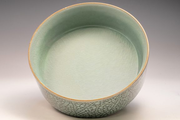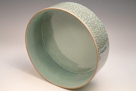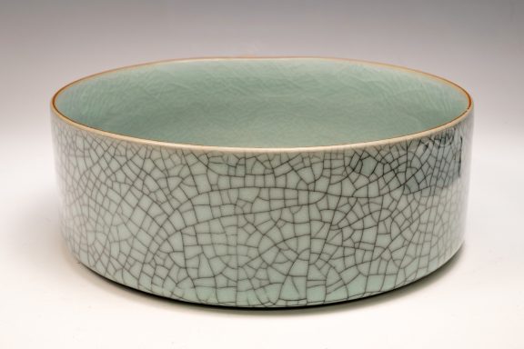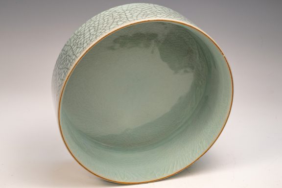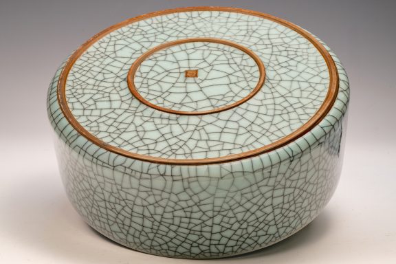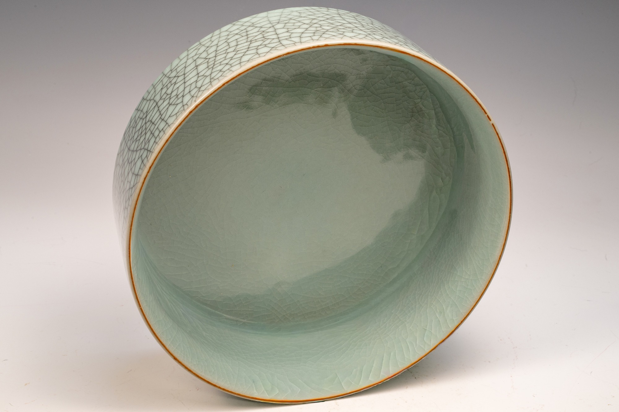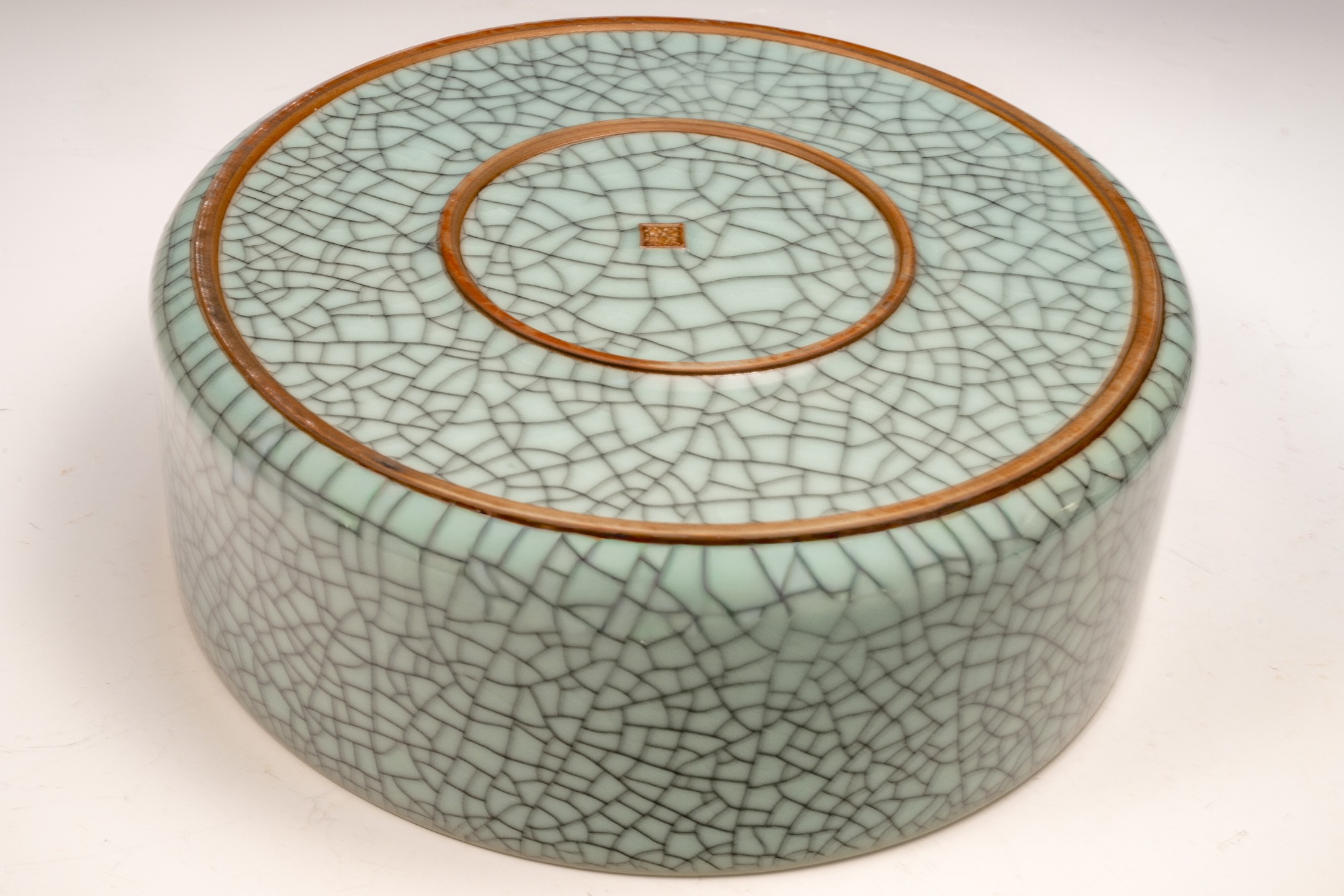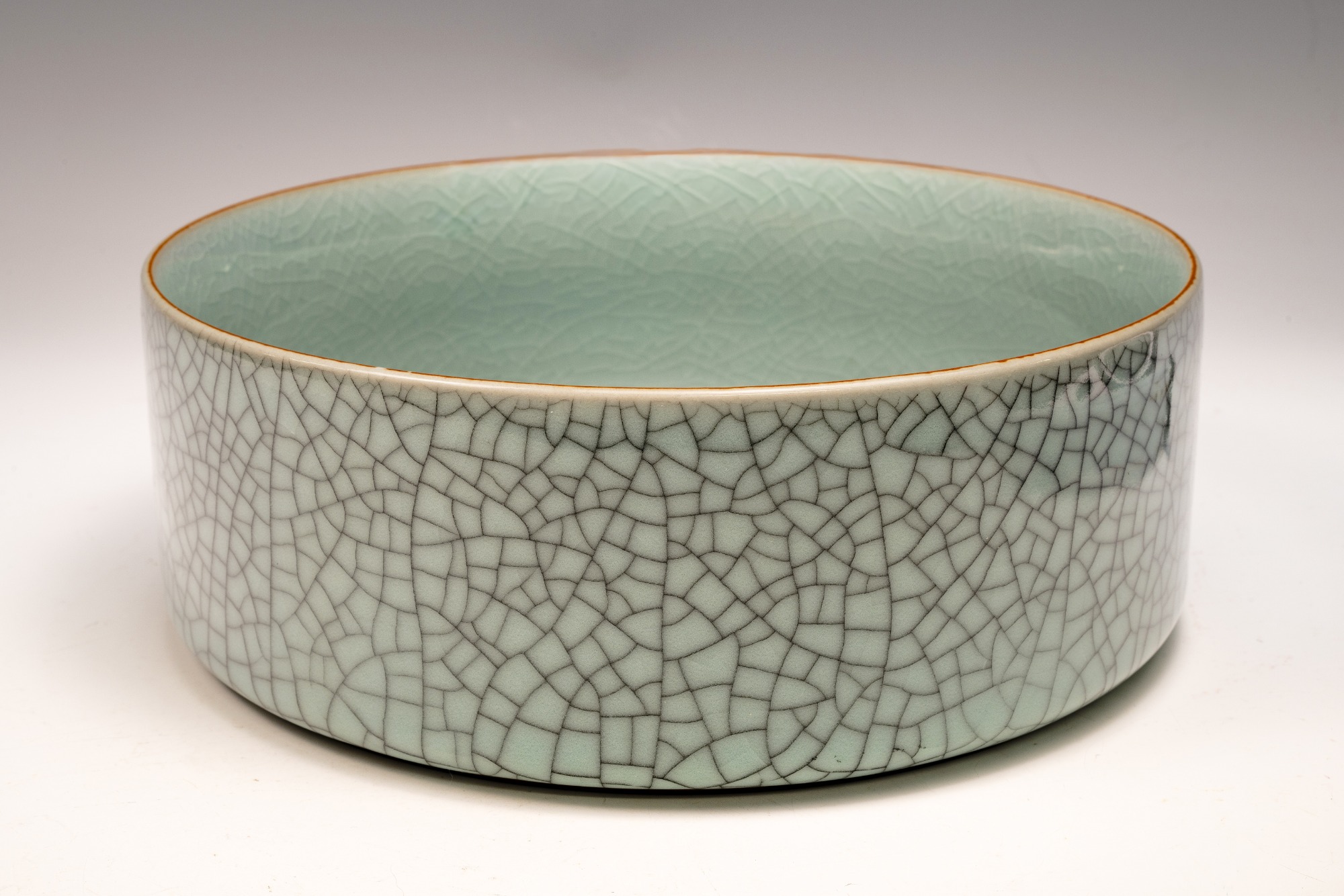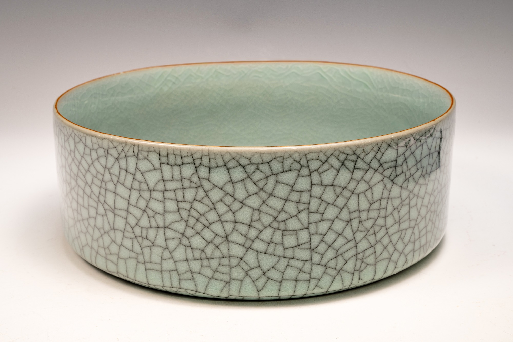 Southern Song Dynasty Double Crackle Brush Washer: This remarkable artifact exemplifies Guan ware from the distinguished Guan Official Kiln and dates back to the Imperial era. It is believed to have been produced at the renowned Xiuneisi inner kiln. The Brush Washer is distinctive for its dual forms of crackle; the exterior crackle typifies the Guan Kiln, while the interior crackle bears resemblance to that of the Ru Kiln. The piece features an official four-character mark on its base and is enhanced by a delicate pale greenish glaze with a crackled finish. Additionally, it is supported by an iron foot, a result of the firing process, which reveals a reddish-brown color. The Southern Song Dynasty was established in 1127 A.D., following the displacement of the Imperial Court by the Jin forces during the Northern Song Dynasty, which necessitated the court's relocation to Hangzhou. This Brush Washer has an approximate diameter of 8 5/8 inches. ppjrs