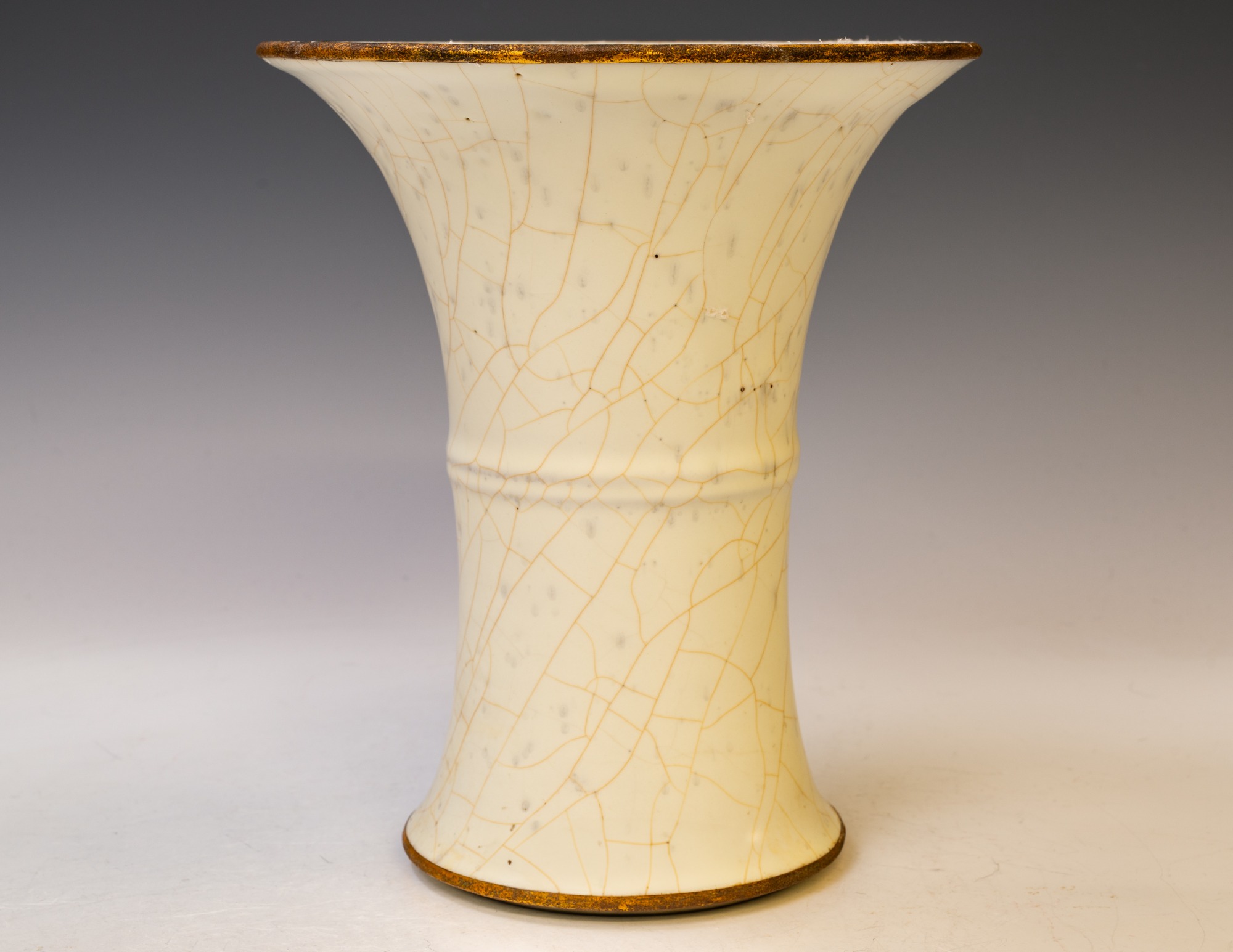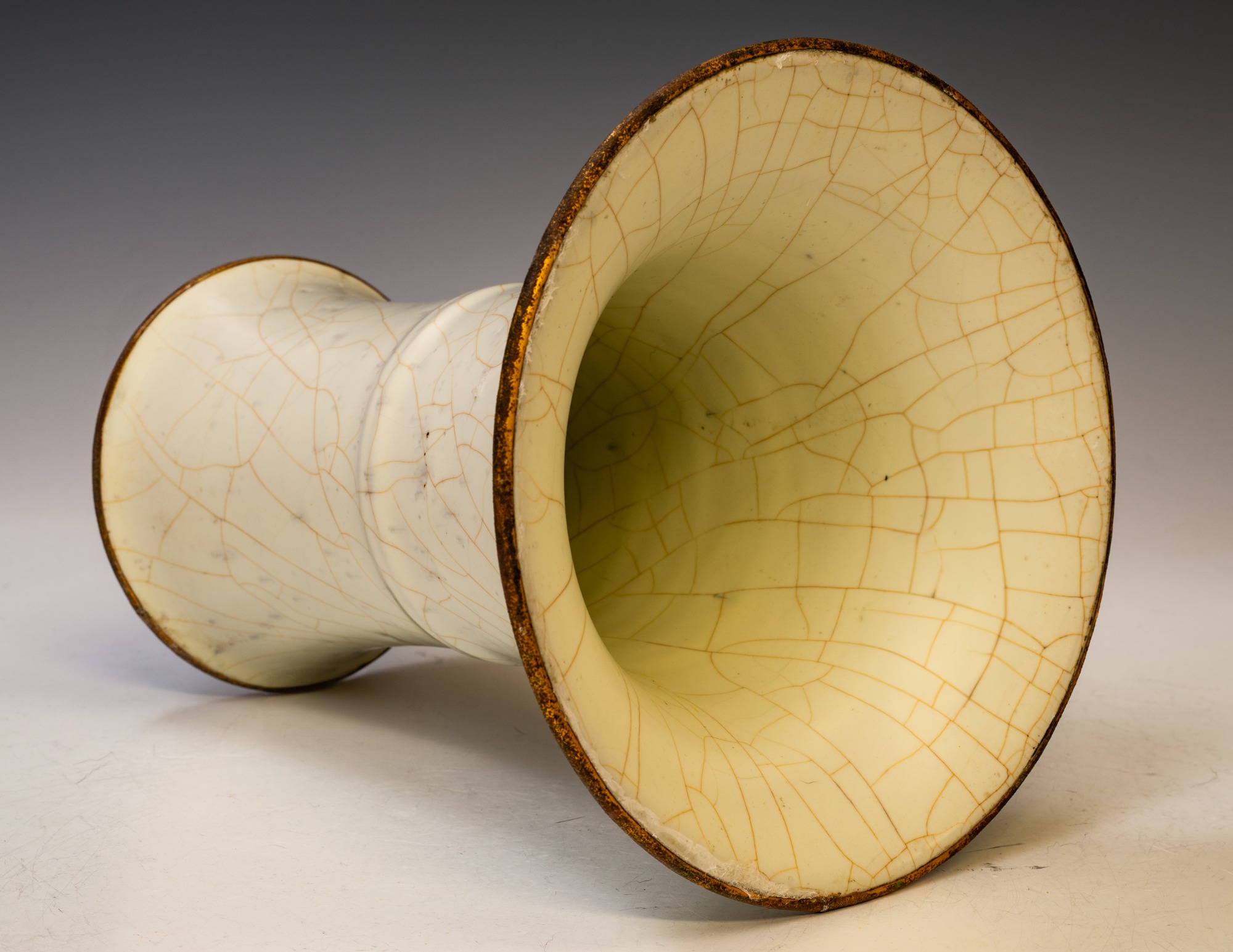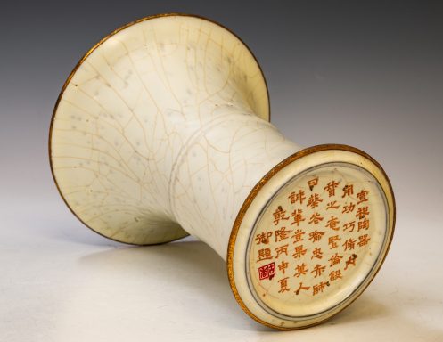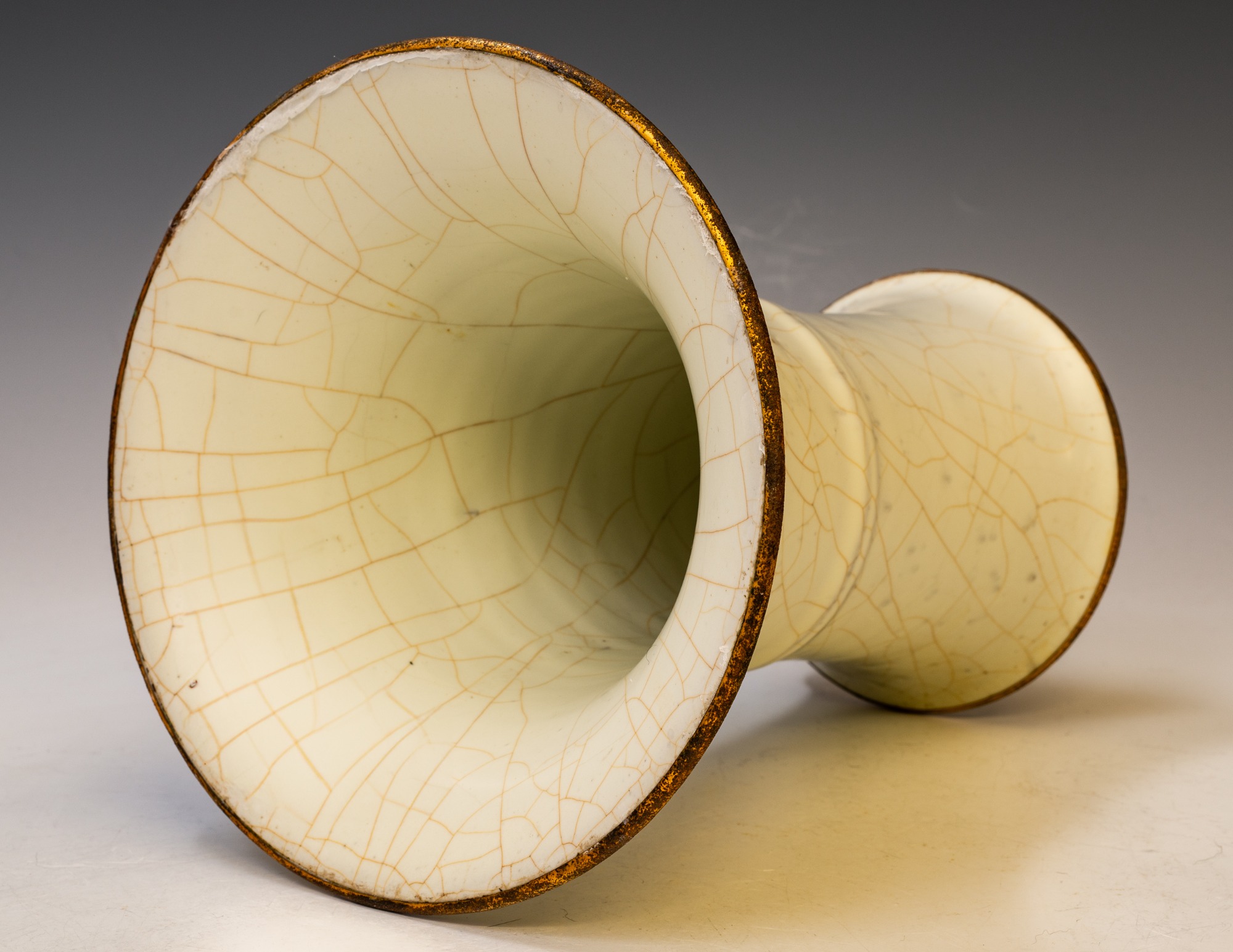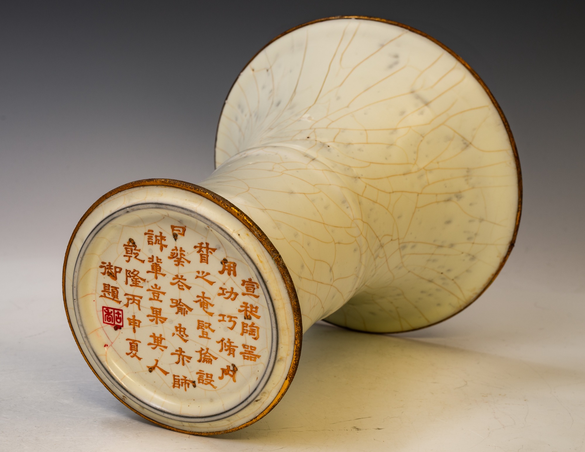 The Guan Yao of the Southern Song Dynasty, produced during the imperial era, features an exemplary Guan ware Beaker Vase. This vessel is distinguished by its crackled off-white glaze and is accentuated by fire-gilded bands encircling both the rim and base. These bands exhibit a layered presence of reddish cuprite and remnants of greenish malachite corrosion. The corrosion phenomenon has infiltrated the pores of the fire-gilded copper bands, serving as significant evidence of the vase's substantial age and authenticity. This distinctive characteristic is regarded as a more reliable indicator of provenance than a thermoluminescence (TL) test, a method utilized by experts to confirm the authenticity of non-replicable artifacts. Additionally, the vase features nine spur marks on the base and is embellished with an incised poem filled with gold, possibly executed during the Qing period. Following the expulsion of the Imperial Court from the Northern Song Dynasty by the Jin armies in 1127 A.D., the court relocated to Hangzhou, thus marking the inception of the Southern Song Dynasty. This Beaker Vase stands approximately 9 inches in height. ppjrs
