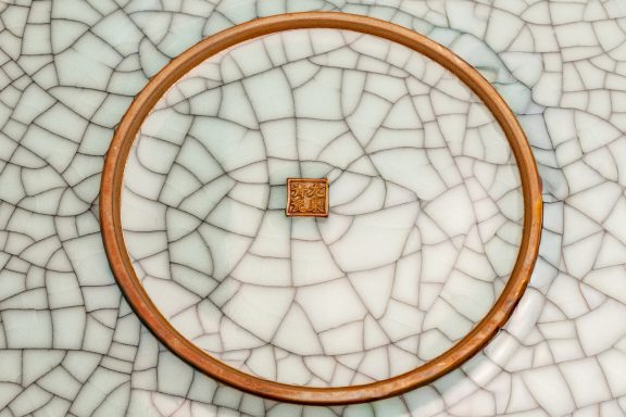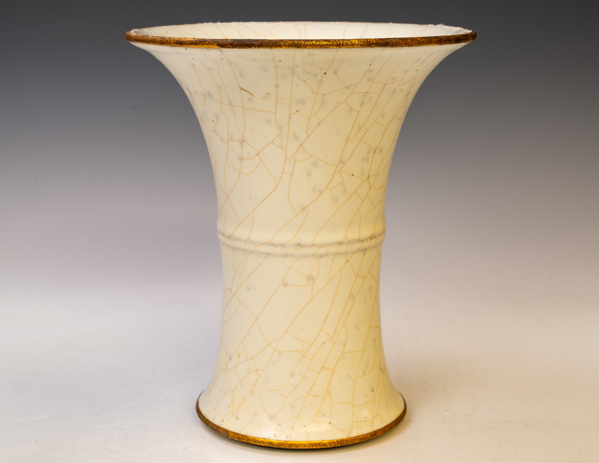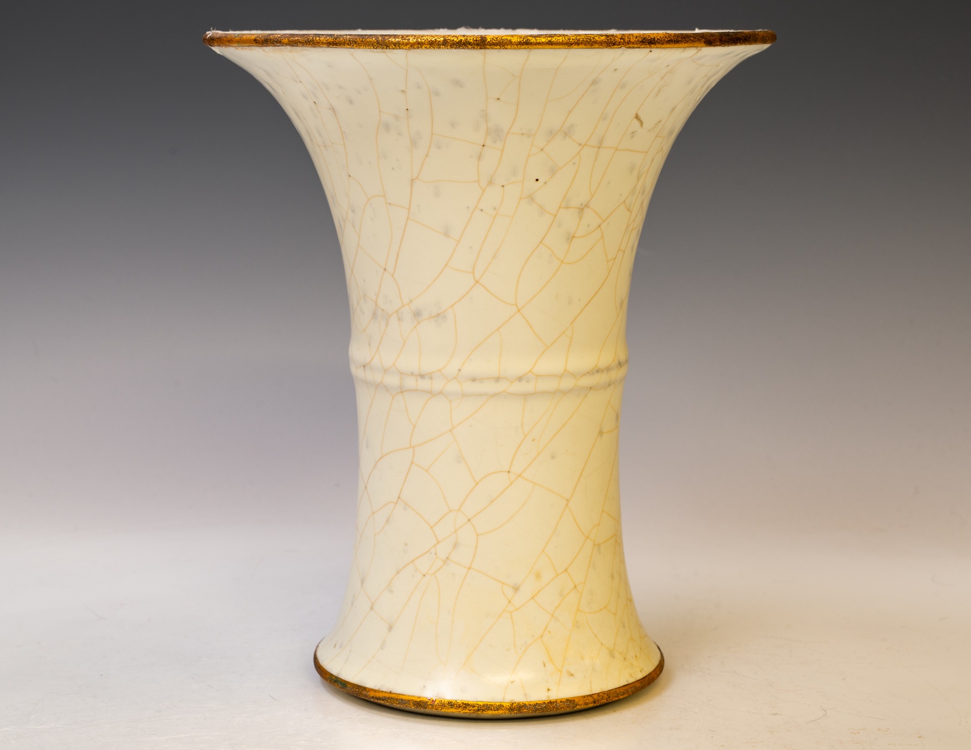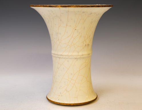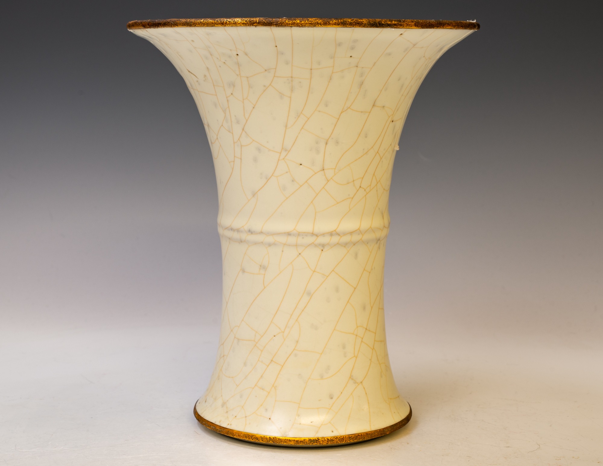 The Guan Yao of the Southern Song Dynasty, produced during the imperial era, features an exemplary Guan ware Beaker Vase. This vessel is distinguished by its crackled off-white glaze and is accentuated by fire-gilded bands encircling both the rim and base. These bands exhibit a layered presence of reddish cuprite and remnants of greenish malachite corrosion. The corrosion phenomenon has infiltrated the pores of the fire-gilded copper bands, serving as significant evidence of the vase's substantial age and authenticity. This distinctive characteristic is regarded as a more reliable indicator of provenance than a thermoluminescence (TL) test, a method utilized by experts to confirm the authenticity of non-replicable artifacts. Additionally, the vase features nine spur marks on the base and is embellished with an incised poem filled with gold, possibly executed during the Qing period. Following the expulsion of the Imperial Court from the Northern Song Dynasty by the Jin armies in 1127 A.D., the court relocated to Hangzhou, thus marking the inception of the Southern Song Dynasty. This Beaker Vase stands approximately 9 inches in height. ppjrs